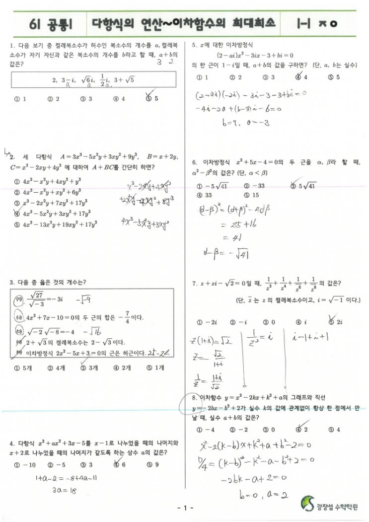 26-1-공통1-11-다항식의 연산~이차함수의 최대최소-원장풀이