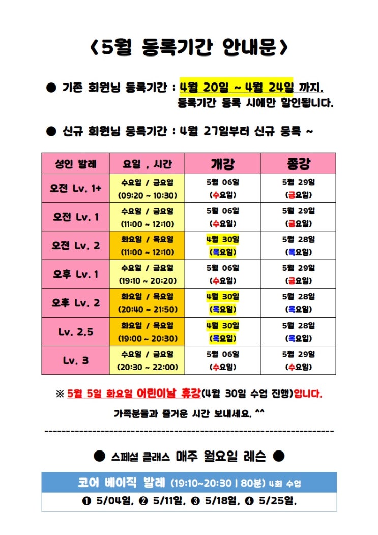 5월 1일은 수업이 없습니다. 코어베이직발레반 25일 대체공휴일 수업 진행합니다. 개강, 휴강, 종강 날짜 한번 더 확인 부탁드립니다. 기존 회원님 은 “바로 이전 달 수강하신 분” 이 적용대상입니다. #취미발레 #더발레아카데미학원 #울산발레학원 #울산성인발레학원 #더발레아카데미_울산 #울산성인발레전문학원 #울산초등발레 #울산초등발레학원 #울산남구발레학원 #울산취미발레 #울산더발레아카데미 #울산발레 #취발러 #성인발레 <img src="https://blogthumb.pstatic.net/MjAyNjA0MTdfMjAx/MDAxNzc2NDIxMzk0NDM5.oQVy4P1LLcNvaSEDkEtbANv7T5Dmm0WGLHLwki8x6Ccg.21moj62q6tGB6QMKZeYWcIltzP_GwycnxExfrDuIgDwg.JPEG/IMG%A3%DF3889.jpg?type=s3" />