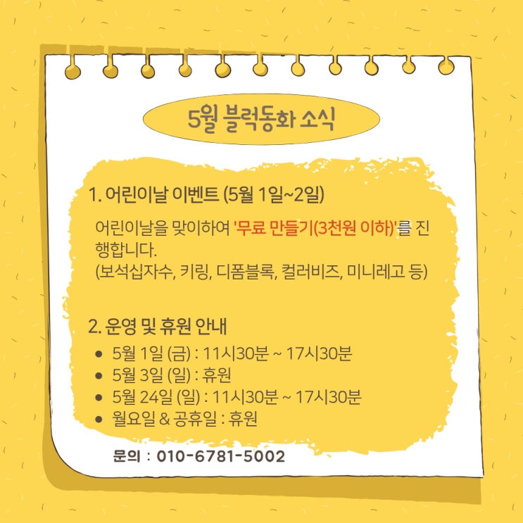 안녕하세요, 블럭동화입니다^^ 어린이날을 맞이하여 5월1일(금)~2일(토) '무료 만들기(3천원 이하)' 이벤트를 진행합니다. 보석십자수, 키링, 디폼블록 등 다양한 만들기가 준비되어 있으니 블럭동화에서 즐거운 시간 보내시길 바랍니다^^ 5월 1일(금) : 11시30분~17시30분 (노동절) 5월 3일(토) : 휴원 5월 24일(일) : 11시30분~17시30분 (부처님 오신 날) 월요일 및 공휴일 : 휴원 <img src="https://blogthumb.pstatic.net/MjAyNjA0MTdfMjE2/MDAxNzc2NDA4MTY5OTgx.ZUmbL1MsXsEeQMyOvtFylNIw9e5-qoSzaSZSk9PiOw4g.rAOKb5t2PHLaHkd8XZ8mHA6rkvKOl-k9l-_pwCaJDScg.PNG/5%BF%F9_%C0%CC%BA%A5%C6%AE.png?type=s3" />