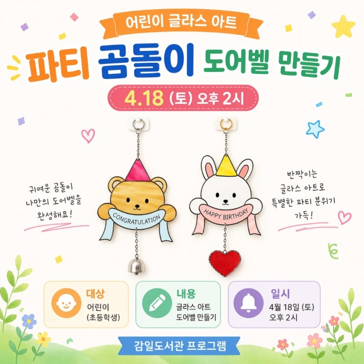 햇볕은 쨍쨍, 글라스아트는 반짝! ✨ 감일도서관에서 어린이 친구들과 즐거운 클래스 진행하고 왔어요. [감일도서관] 초등 글라스아트 파티 캐릭터 도어벨 만들기 따스한 봄볕이 내리쬐는 도서관, 우리 아이들의 웃음소리까지 더해져서 넘 행복한 시간이었네요.✨️ 우리 어린이 친구들 실력이 기대이상! 개성만점 귀욤뽀짝한 작품들로 눈호강 했지요. 아이들의 눈높이에서 나오는 순수한 감각들은 언제 봐도 정말 최고인 것 같아요. "선생님 이거 봐요!" 눈을 반짝이며 자랑하는 아이들 모습에 감동감동... 꺄~같은 도안인데도 아이들의 손길을 거치니 이렇게 다채로운 작품들로 탄생하네요. 우리 친구들! 오....... <img src="https://blogthumb.pstatic.net/MjAyNjA0MTlfNiAg/MDAxNzc2NTU3MjEzOTk0.Hf_yDcyLK8b4bV7Vub9oYQCvLFdlrNNoP7mVIKhCk-Ig.ZshU-4xjMDsUvwStCyO3H8nCJFrYcyd2lSnuFgB6SWYg.JPEG/900_1776523394313.jpg?type=s3" />
