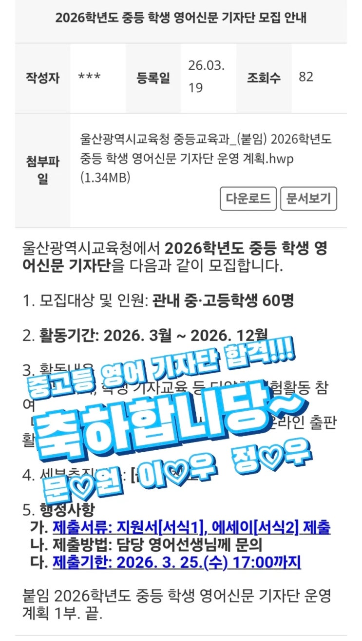 최근 블로그를 거의 하지않았네요 다시 조금씩 적어보기로~ 일단 즐거운것부터~~ 추카추카 교육청주최 울산학생신문기자단(USEN) 합격 !!!!! 울산에 있는 모든 중고등학교에서 신청~ 우리학원에서 희망한3명 접수했는데 다 걸렸네요 특히 강남중은 10명 지원에 5명 합격인데 우리애들이 3명~~ ㅋㅋ 특히 셋은 어릴때부터 학원 모든 대회에 항상 나갔던 애들이란 공통점~~ 이번엔 지원자도 많아서 예정날짜보다 늦게 발표되었는데~~~~ 특히 2학년은 다 떨어지고 우리 ♡원이만 합격~ 직접 알려주고싶어 수업끝나자마자 학원으로 달려온 원이~♡ 자기소개서 영어에세이-다소 주제가 어려웠지만 애들들이 열심 자료찾고 쓰고 마지막 최종첨....... <img src="https://blogthumb.pstatic.net/MjAyNjA0MThfMjkz/MDAxNzc2NTE2Mjg2MTM2.PkoksTYq_yugIAP3sPDjb78v6yXQYNMF_MTIPK5lMXcg.alb4VONucbl_5oXmDohaPr9YX2VegpweQhpTP9a2yXQg.JPEG/900%A3%DFcu1775391461309.jpg?type=s3" />