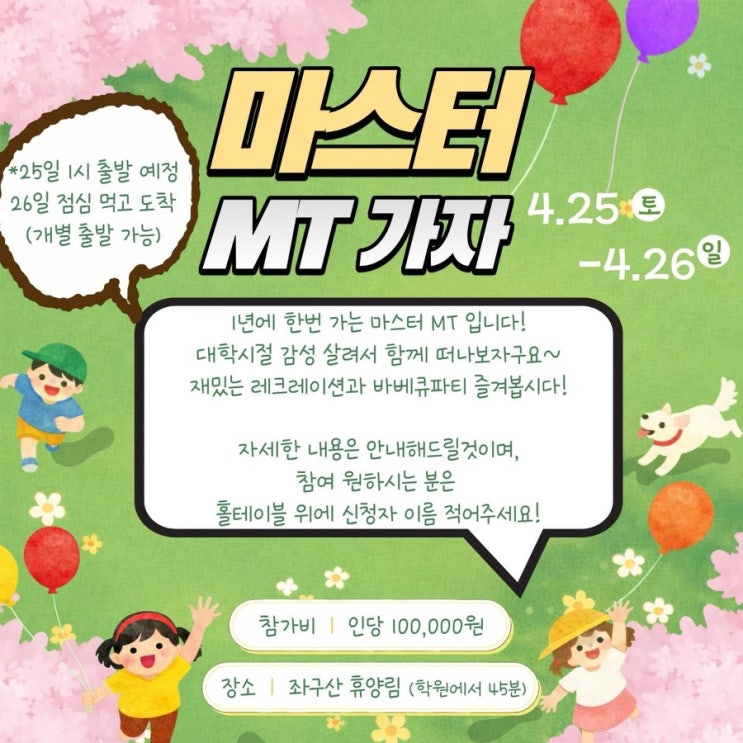안녕하세요! 청주 성인전문 마스터음악학원입니다 1년에 딱 한번 가는 MT! 매년 날씨 좋은 봄,가을에 갈까? 물놀이 하는 여름에 갈까? 늘 고민하는데! 이번 우리의 선택은?!?!? 날씨 너무 좋은 이번주 주말!! 운이 좋게도 학원에서 그리 멀지않은 증평 좌구산 휴양림으로 숙소가 정해졌어요!! 미리 사전조사를 받았는데 이번엔 신청자들 소규모로 다녀올듯해여! 이런 날 진짜로 야외에서 바베큐하면 낭만 끝장이자나여…….벌써 설레고. 고기 엄청많이 먹을거고.ㅎㅎ 이번 엠티에서도 좋은추억 엄청 많이많이 쌓고오자아? #청주성인음악학원 #청주성인피아노 #청주드럼 #청주기타 #청주보컬 <img src="https://blogthumb.pstatic.net/MjAyNjA0MThfODIg/MDAxNzc2NTAzMTEwMTYx.LAKN8IJ8R6ylevijss0QMttCRczjAEKBt826K6Kp1kcg.HwCrliRmH0LUf7jzUTENIAgxOmIkopPpNSlcyXtRr8Yg.JPEG/IMG%A3%DF0177.JPG?type=s3" />
