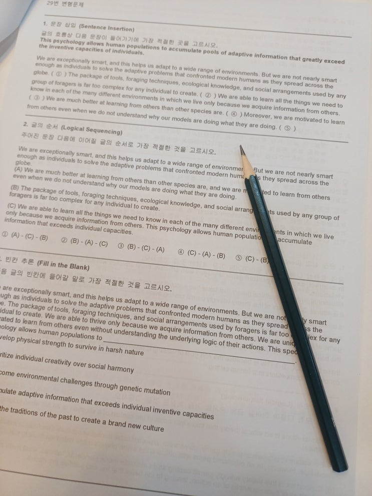 2026년 대수능 영어 기출 기반 변형문제 자체 분석 제작 ^^ * 30번~ 40번 고난도 구간 집중 분석 * 순서,배열, 삽입, 빈칸 유형별 문제 출제 * 최근년도 사동고 실전 기출 난이도 구현 첨부 : 2026년 대수능 기출 변형문제 <img src="https://blogthumb.pstatic.net/MjAyNjA0MjRfODIg/MDAxNzc3MDE2MzMyODU2.uzGZcTOU7G8BBc-Psd_iikHlCBD2AuCFQZzmT2rOpdMg.IkrdPt7ZDKf_MJcGfp-BLynQq8A5yNu-JfyOKS1KSyEg.JPEG/KakaoTalk_20260424_162930956.jpg?type=s3" />