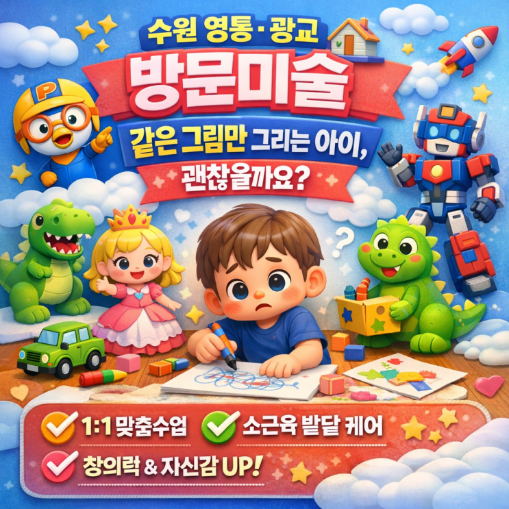 안녕하세요. 홍익아트 방문미술 수원 영통·광교지사입니다. ✔ 스스로 그리지 않고 “그려달라”고 하는 아이 ✔ 공룡, 자동차, 로봇, 공주, 아기상어 등 같은 그림만 반복하는 아이 ✔ 특정 색만 계속 사용하는 아이 ✔ 손에 힘이 약하고 소근육 발달이 느린 아이 ✔ 가만히 앉아있지 못하는 아이 ✔ 언어·신체 발달이 느린 아이 ✔ 자폐 스펙트럼 경계 / ADHD 경계 아동 이런 고민을 가진 학부모님들의 문의가 최근 크게 늘고 있습니다. ❗ “같은 그림만 그려요… 괜찮은 걸까요?” 결론부터 말씀드리면 정상적인 발달 과정일 가능성이 매우 높습니다. 아이들은 자신이 좋아하는 대상에 집중하면서 ✔ 안정감을 느끼고 ✔ 표현을 반복하....... <img src="https://blogthumb.pstatic.net/MjAyNjA0MTNfMTYx/MDAxNzc2MDg3NjM0NDg1.oyxpBvNhdk_7h1Fv34pbLUUnQWd69yXXFpmPT1tkA4Ag.SfZwH0fn84C6BNCRU89bnLFRrTiu9S6i-UlyoYTsO7Qg.PNG/%B0%B0%C0%BA%B1%D7%B8%B2.png?type=s3" />