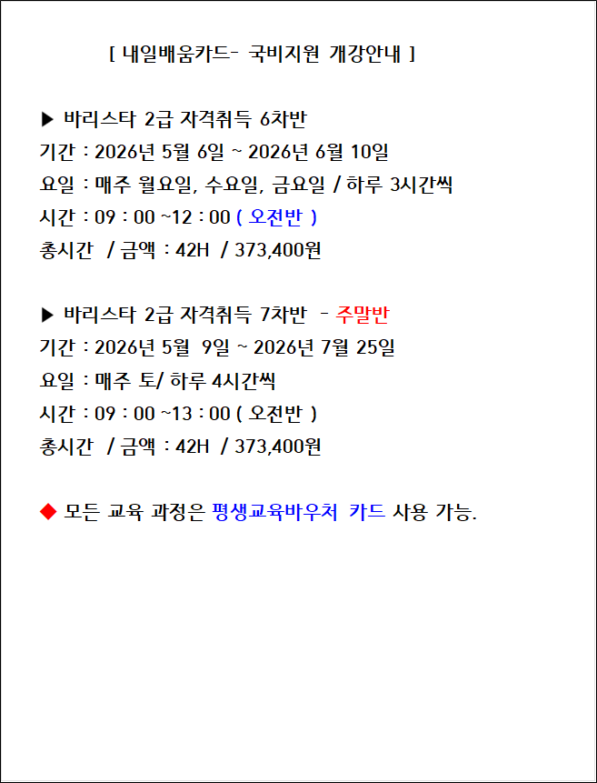 5월에는 주말반 개설이 됩니다. 평일에 참여가 불가능하신 분들에게 좋은 기회이니 서둘러서 신청부탁합니다^^ 내일배움카드 소지자 분들은 https://m.work24.go.kr/cm/main.do 위의 로그인해서 수강신청 하고, #평생교육바우처 카드소지자 또는 일반카드 소지자 분들은 학원으로 전화접수 가능합니다 <img src="https://blogthumb.pstatic.net/MjAyNjA0MTVfMTc3/MDAxNzc2MjE2Njc1OTAw.JAJ4Evsco8HtTxr7cJzlRy_lv6pO7U8F3FaOwLkcf0kg.JEBpdSirTHsFVqJ4vi75qoA8PJePEHCv4CvjC_ai8tYg.PNG/1776215305791.png?type=s3" />
