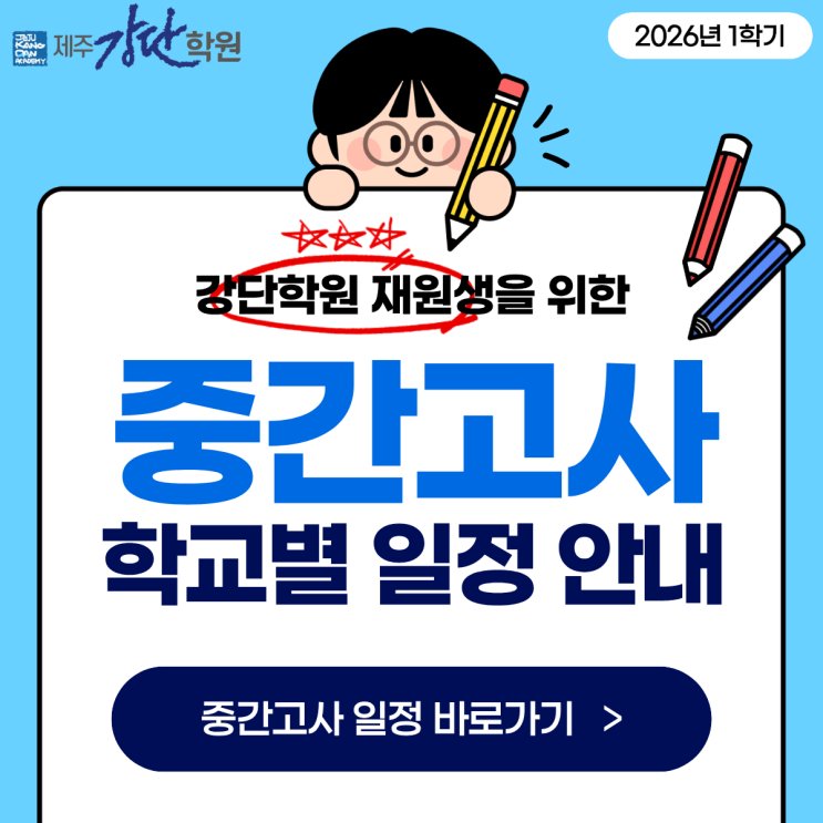 강단학원 학생, 학부모님을 위해 학교별 중간고사 일정을 안내드립니다. 2026년의 첫 시험인 만큼 열심히 준비하여 좋은 결과 있길 기원합니다! ▶ 강단학원 대표 전화 T. 702-5297 #제주강단학원 #강단학원 #예비고3국어수업#예비고3국어강좌#제주국어 #제주국어 #제주국어학원 #제주시국어학원 #수능국어#제주국어전문학원 #제주중등국어 #제주고등국어 #중등국어 #고등국어 #수능국어 #제주영어 #제주영어학원 #제주시영어학원 #제주영어전문학원 #제주중등영어 #제주고등영어 #중등영어 #고등영어 #수능영어 #제주수학 #제주수학학원 #제주시수학학원 #제주수학전문학원 #제주중등수학 #제주고등수학 #중등수학 #고등수학 #수능수학 #제주내....... <img src="https://blogthumb.pstatic.net/MjAyNjA0MThfMjc4/MDAxNzc2NDg2MjU2OTM2.7i8AUtdNczlfrDDoPXZE65aScavtnoTDrmtmY557YPAg.Shb-tu0NcDhaHa1VwJ-NtBP5GAjqqNnz_mI4YRET0D8g.PNG/1.png?type=s3" />
