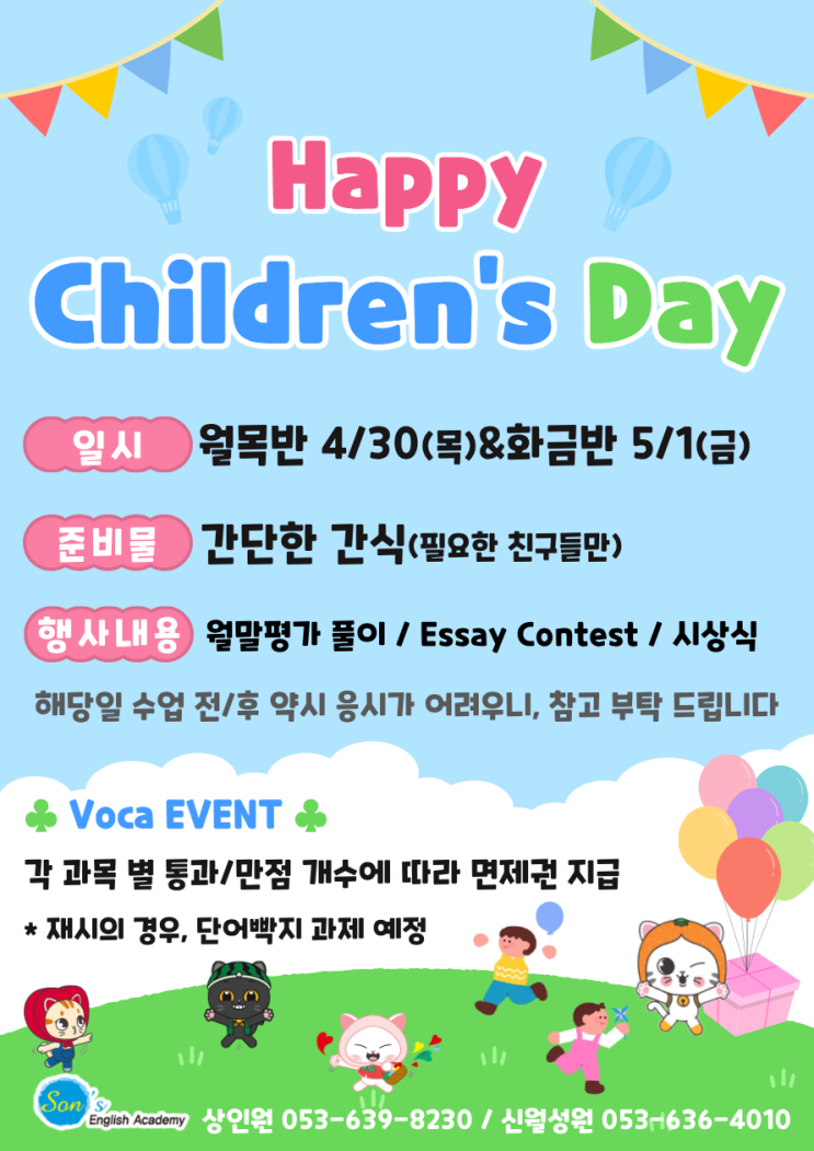 안녕하세요 손샘영어 상인/신월성원 입니다 다가오는 5월! 손샘영어 친구들이 어린이날에 어떤 이벤트가 있는지 잔뜩 기대하고 있는 중입니다 ㅎㅎ 손샘영어 상인/신월성원 어린이날 이벤트는 월목반 4/30(목)&화금반 5/1(금) 에 진행될 예정입니다 ★ Children's Day를 재밌게 즐기기 위해 해당일 수업 전/후 약시 응시가 어려운 점 양해 부탁 드립니다 또한, 선생님들이 다양한 시상식과 함께 누구나 받을 수 있는 선물도 준비하고 있으니 자세한 내용은 아래 안내문 참고 부탁 드립니다 ✅ 5/1(금) 초등부 Children's Day Event / 중등부 휴강 ✅ 5/5(화) 초/중등부 휴강 학원 휴무기간에는 전화상담 및 방문 결제가 불가....... <img src="https://blogthumb.pstatic.net/MjAyNjA0MjFfMTA4/MDAxNzc2NzU4MjQzNjk3.WwCjRxJ5prvgbvdcDFD9djN8hEr-tDZhrdx-gF_afq0g.eGQVV0TDwxkrDpEzY6NuAKX50gjVb4u8Iq6YsZnN2rcg.PNG/%BB%F3%C0%CE_%C3%CA%B5%EE_%BE%EE%B8%B0%C0%CC%B3%AF_%283%29.png?type=s3" />