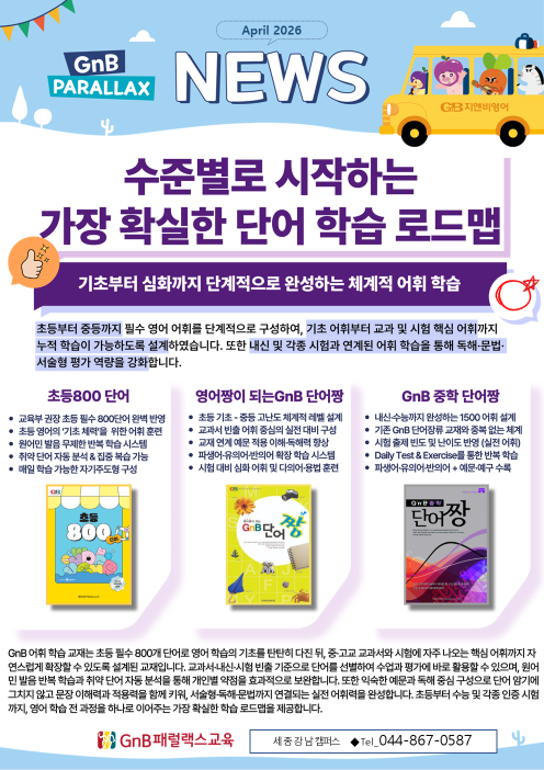만물이 소생하는 봄과 함께 우리 학생들의 영어실력도 활짝 꽃피우기 위하여 "세종강남GNB 단어왕대회"를 개최합니다. 저희 원에서는 학생들의 학습의욕을 높이고 실력을 한단계 끌어올려 영어자신감을 키워주고자, 매년 상반기. 하반기에 걸쳐 재원생들을 대상으로 단어왕contest를 진행하고 있습니다. 영어의 첫걸음은 어휘, 즉 영어단어입니다. 단어를 공부하지 않는다면 영어문장의 기본 구성요소인 구와 절을 이해하지 못하게 되고, 이로 인해 독해 능력이 떨어지게 되며 글을 이해하는 문해력도 덩달아 떨어지게 되는 것입니다. 단어를 많이 알고 있으면 지문을 읽는 속도가 빨라지고 구문의 의미를 더 정확하게 이해하며 영어 자....... <img src="https://blogthumb.pstatic.net/MjAyNjA0MTZfMjEw/MDAxNzc2MzM2MTkwNzQ3.cbQoZV2-p8uloKk2tDUQ4XLZGPZ2hVm-y5l0tpPwUeIg.NxsH-KMquLwh0b1ZAZxdEtn87aF7ljqiKMmBPAAFiXAg.PNG/image.png?type=s3" />