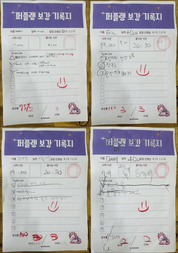 [세종 고운동 퍼플랭 영수학원] 정기보강기록지(4.20)