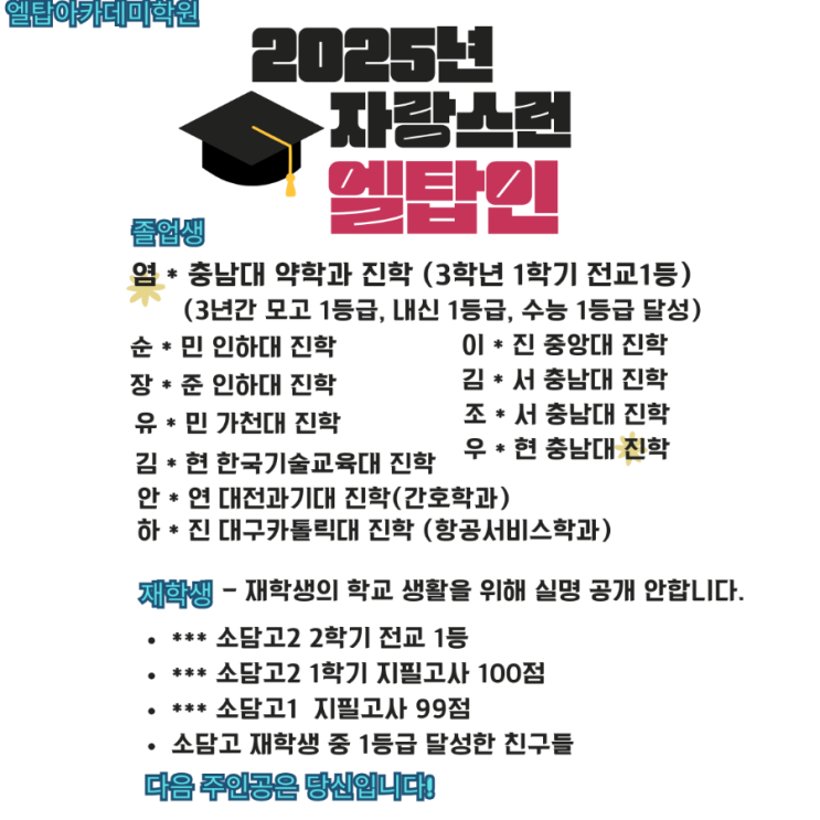 다소 늦었지만 2025년 진학 결과를 게시합니다. 연락이 안 온 친구들도 어디선가 잘 살고 있겠지? 지난 해에는 전체 재학생 수십 명 중에 단 4명을 제외한 모든 친구들이 9등급 기준 3등급 이상 달성 5등급 기준 2등급 이상 달성 이라는 쾌거를 이루었습니다. 성적향상 재학생 명단을 다 적는다면 2명을 제외한 모든 학생을 적어야할 거에요. ㅡㅡㅡㅡㅡㅡㅡ 엘탑인들의 성적이 오르는 것은 90%이상 본인의 부단한 노력 덕분입니다. 그리고 알파쌤의 고퀄자료와 학습 시스템 때문이겠죠. 스스로 깨닫지 못하는 작은 차이를 발견하고 조언해주고 이끌어주는 것은 누구나 할 수 있는 일이 아닙니다. 21세에 처음 교육계에 발을 들여놓은 순간 이후....... <img src="https://blogthumb.pstatic.net/MjAyNjA0MjFfMjE5/MDAxNzc2NzQzNjM2MjI3.qUna_md1cUu-D1PoGcnu97vJv5W1jOu0aDieFJEGcKwg.BpYSTPG6c72nDvO7_Qh2TYXU9stg710M_S14df4-Gdog.PNG/900_%B0%CB%C1%A4%BB%F6_%BA%A3%C0%CC%C1%F6%BB%F6_%BD%C9%C7%C3%C7%D1_%C1%B9%BE%F7_%C3%E0%C7%CF_%BF%F8%C7%FC_%BD%BA%C6%BC%C4%BF_%281%29.png?type=s3" />