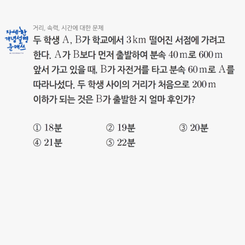 중2수학 일차부등식 단원, 부등식의 활용의 '거리, 속력, 시간(거속시)' 심화문제 입니다. 앞서가는 사람을 뒤에서 쫓아가는 상황, 가능 동안 앞 사람도 계속 이동하기 때문에 식을 세우기가 쉽지 않아 보입니다. 문제의 상황을 직관적인 그림으로 정리하고 문제에서 요구하는 것에 따라 거리, 속력, 시간 중 미지수를 정하여 뜻에 맞게 식을 세우면 어렵지 않습니다. 두 사람의 '거리 차이'에 집중하여 부등식을 세우고 문제를 해결하는 과정을 학습할 수 있습니다. 풀이 방법은 아래 영상에서 만나볼 수 있습니다. 개념설명은 관련 유튜브 영상을 참고하세요 #중2수학 #중학교수학 #일차부등식 #일차부등식활용 #거속시 #응....... <img src="https://blogthumb.pstatic.net/MjAyNjA0MjFfMjIz/MDAxNzc2NzQ4MjM0NDE0.vuQdk3kDMTCNdsh7GWckG5jU5ZWxm8uZz4jEqXhSJpkg.D4qkOdO6I0k6lVQuF9FEk0HXuowzuk9UOkdeHnC2oBEg.PNG/%C0%C0%BF%EB%BD%C9%C8%AD%C0%AF%C7%FC_%BA%ED%B7%CE%B1%D7_%C0%CC%B9%CC%C1%F6%28%B0%C5%BC%D3%BD%C3_%B9%AE%C1%A6%29.png?type=s3" />
