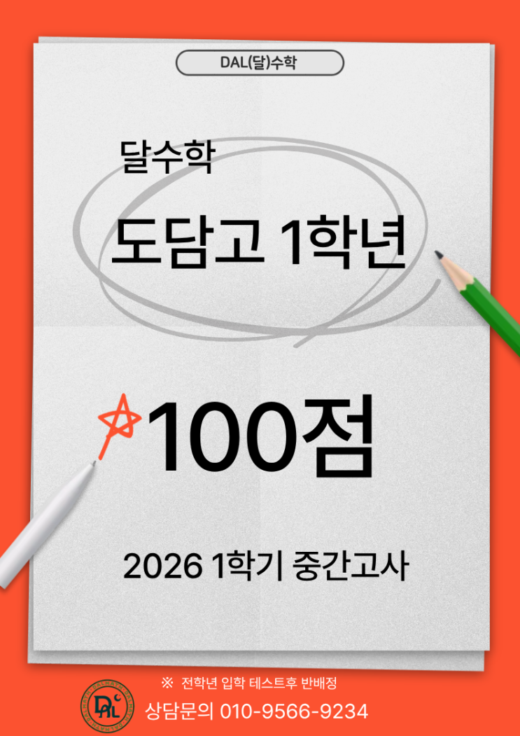 안녕하세요 달수학입니다. 중간고사 시험이 드디어 시작했습니다. 그 첫 학교는 도담고~ 수학 시험을 치르는 당일에는 원장인 저 역시 학원에 일찍 출근하여 아이들의 소식을 기다립니다. 잘 한 친구는 칭찬해주고 잘 못 본 친구는 위로해주고 격려해 줍니다. 한 학생이 좋은 소식을 들고왔네요. 안좋은 소식은 아직 없네요. ㅎㅎ 100점이라는 말은 매번 들어도 기분이 좋아집니다.~ 우리 아이들이 수학을 즐겁게 생각하고 잘할 수 있도록 함께 노력하겠습니다. 수학의 자신감 DAL 달수학! <img src="https://blogthumb.pstatic.net/MjAyNjA0MjFfNzgg/MDAxNzc2NzQzNDc3MzE2.jsqQGpLJRzdnE9eNdN9iT4qWKgnbAN3YoIuIIXCzedkg.3PFUo9ij_h4xuJG6N0ivFaiA54ig4BdFXml223CnC5Qg.PNG/%B5%B5%B4%E3_100_%281%29.png?type=s3" />