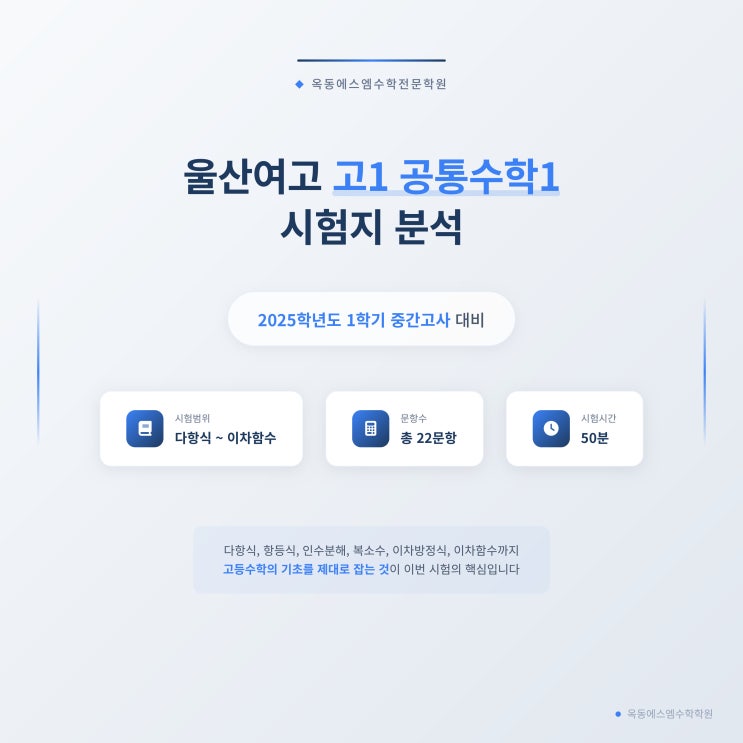 옥동에스엠수학전문학원입니다. 이번에는 2025학년도 울산여고 1학년 1학기 중간고사 대비 공통수학1 시험지를 바탕으로, 실제 시험이 어떤 방식으로 출제되었는지 자세히 분석해보려고 합니다. 시험범위는 다항식부터 이차방정식과 이차함수까지이며, 세부적으로는 다항식의 연산, 항등식과 나머지정리, 인수분해, 복소수, 이차방정식, 이차함수가 모두 포함되어 있습니다. 단순 계산 문제만 있는 시험이 아니라, 기본 계산을 정확히 할 수 있는지부터 개념을 연결해서 적용할 수 있는지까지 단계적으로 묻는 구성이었습니다. 이번 시험지는 총 22문항으로 구성되어 있었고, 앞부분은 비교적 기본 개념과 계산을 확인하는 문제들이 배치되어 있....... <img src="https://blogthumb.pstatic.net/MjAyNjA0MDhfMjA1/MDAxNzc1NjE4Njk3MTQz.EdggghwS-4lqE2P38OPSdqYQXFTxwPyu5yKuYKtrqTkg.Ov7_7KIFAVT6BDCEI9n7Ascc4rHCi9sTv-laTnn1kwYg.JPEG/ulsan_girls_high_math1_analysis_20260408032308-1.jpg?type=s3" />