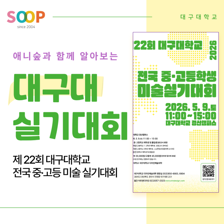 애니숲이 알려주는 2026 대구대학교 미술실기대회 완벽 정리 중학생부터 고등학생까지 모두 참여 가능한 실기대회! 안녕하세요 애니숲미술학원입니다! 요즘 실기대회 시즌이 다가오면서 학생들과 학부모님들 모두 어떤 대회를 준비해야 할지 우리 아이에게 맞는 대회는 무엇인지 고민이 많으실 텐데요~! 오늘은 중학생부터 고등학생까지 참여 가능한 2026 제22회 대구대학교 전국 중고등학생 미술 실기대회를 자세하게 안내해 드리겠습니다! 2026년 제 22회 대구대학교 미술실기대회 이번 대구대 실기대회는 다양한 미술 분야를 폭넓게 경험할 수 있는 실기대회인데요 기초디자인 정밀묘사 회화 만화(칸만화, 상황표현) 등 전반적인 미술 실기 역....... <img src="https://blogthumb.pstatic.net/MjAyNjA0MTRfMjI4/MDAxNzc2MTUwODY5OTM3.OqxAQwaYS29a5ZDOcMkusHLv4VRXaSSf1XBNq_dHIxwg.EAZqa6emdCB1KVYVWSgqcARgvA1pDNvgDVRNEhgPN-8g.PNG/4.png?type=s3" />