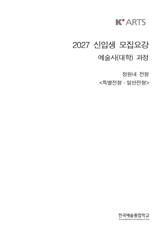 2027학년도 한국예술종합학교 예술사 모집요강 전형구분입니다. 일반전형 / 특별전형 일정 확인해 주세요. 음악원 세부전공별 모집인원입니다. 일반전형 / 특별전형 꼼꼼히 확인하시고 지원자격 해당되는 전형으로 접수하시기 바랍니다. 일반전형 / 특별전형 시간표입니다. 꼼꼼하게 확인해 주세요. ※ 특별전형 : 예술영재로 선발 된 자 <본 교 부설기관인 '한국예술영재교육원'이 아님에 유의> 피아노 전공실기 과제곡입니다. <1차> *전체암보 1. W. A. Mozart or J. Haydn의 Sonata 중 한 곡 (전 악장) <연주곡명 기재> 2. F. Chopin Etude 중 한 곡 <연주곡명 기재> 3. F. Liszt, S. Rachmaninoff, A. Scr....... <img src="https://blogthumb.pstatic.net/MjAyNjA0MTVfMTc5/MDAxNzc2MjQ3NjI1NDgy.C7OjyABrpBp3mFXXYlyKSGVlFpsGTSUgosKv-Hnjwhwg.U08N-Ar9EwKIvcJVR6jkM1kxjdfhV7WzMFa_YH5iY88g.JPEG/1.jpg?type=s3" />