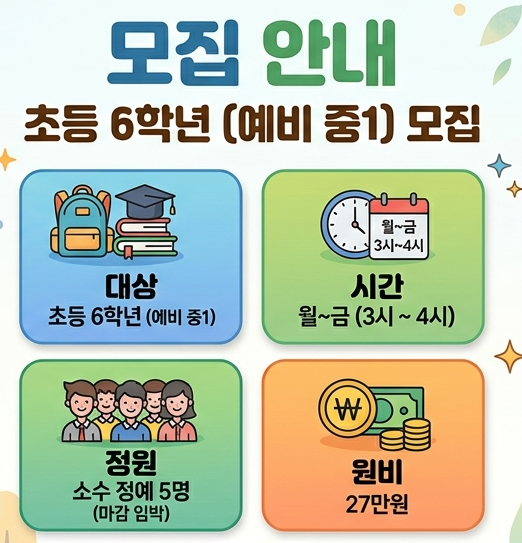 안녕하세요 옥동 윤선생영어숲 정진수학학원입니다. 내년이면 중학생이 되는 초등학교 6학년 자녀를 둔 부모님이라면 요즘 부쩍 이런저런 고민이 많아지셨을 겁니다. "주변은 벌써 선행을 많이 나갔다는데..." "중학교 가면 수학이 어려워진다던데..." 수많은 아이들을 가르치면서 느낀 점은 수학을 얼마나 빨리 시작하는 보다 어떻게 시작해서 고등수학까지 버틸 '근육'을 만드냐가 핵심이라는 것입니다. 왜 중학교 수학에서 무너질까요? 초등 때까지 잘하던 아이가 중학생이 되면 당황해합니다. 이유는 단순합니다. 수박 겉 핥기 식 공부: 개념 이해 없이 진도만 뺀 경우 나쁜 습관: 오답 분석 없이 답만 고치고....... <img src="https://blogthumb.pstatic.net/MjAyNjA0MjFfMTEx/MDAxNzc2NzY3MDU2NDUx.gqoOT6GUr8evbADKH1WDQOBppzplKgUJ4z-rdFZ5sgIg.fbM892BsOu5WK-unW1VeDlR1Z1ixppZxkWmy5LjlU78g.PNG/image.png?type=s3" />