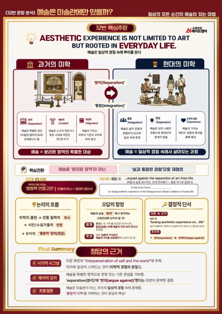 '축구장에 간 바둑기사?' 고2 영어, 논리의 판을 뒤집다 [3월 학평 오답률 TOP 5, 분석시리즈 1️⃣] 안녕하세요, 천천에이드영어입니다. :) 어려웠다고 평가받은 이번 고2 3월 학평. 시험은 끝났지만, 이 지문들은 곧 내신의 핵심 연계 문항으로 다시 탄생하게 됩니다:) 단순한 '단어 암기'만으로는 1등급의 벽을 넘을 수 없습니다. 출제자가 설계한 '생각의 프레임'을 읽어내는 힘이 필요합니다. 이번 오답률 상위권인 32번과 33번 지문을 통해, 우리가 가진 상식을 기분 좋게 배반하는 '인식의 전환' 두 가지를 분석해 보았습니다. ️ 1. 예술의 재발견 : 미술관의 벽을 허물다 (32번) "예....... <img src="https://blogthumb.pstatic.net/MjAyNjA0MjlfMTQ5/MDAxNzc3NDMxMTc0NDA2.EhQUYBDDnlXcKXLRGt841eVB2mAPGW7Meu96xdYw5nEg.cV2rLScGoq8nH4nAriYV0Rru0iEV7D8jNfftbpCYbEQg.JPEG/900_%B0%ED2_%B8%F0%C0%C7%B0%ED%BB%E7_%BA%D0%BC%AE_%28A4%29_20260428_215403_0000_260429_100904_1.jpg?type=s3" />