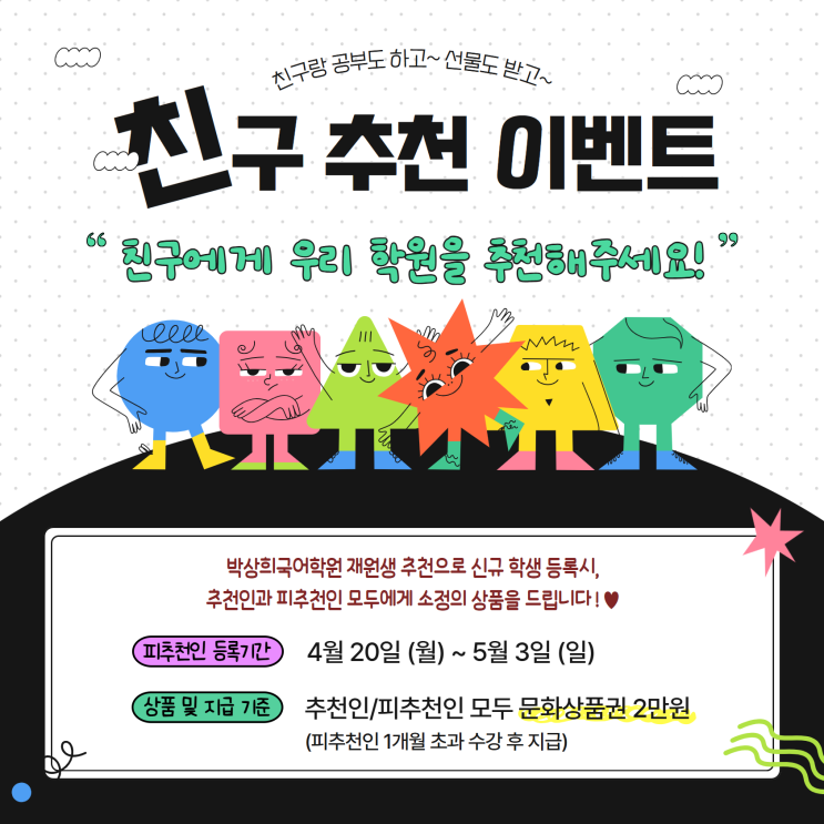 안녕하세요, 박상희국어학원입니다. 친구 추천 이벤트 소식 전해드립니다! 친구를 소개한 학생도, 소개 받아 박상희국어학원에 온 학생도 모두 문화상품권 2만원 혜택을 받아갈 수 있으니 우리 학원을 주변에 많이 많이 알려 주세요~ 박상희국어학원 재원생 추천으로 신규 학생 등록시 추천인과 피추천인 모두에게 상품을 드립니다! ♥ ★ 등록기간 : 4/20(월)~5/3(일) ★ 상품 : 문화상품권 2만원 (피추천인 1개월 초과 수강 후 지급) 수강 신청 및 문의 사항은 학원으로 연락 부탁드립니다. <img src="https://blogthumb.pstatic.net/MjAyNjA0MjFfMjAz/MDAxNzc2NzQyMTI2NzQx.ZCt-0-frVSydrc1Sfml0fXlxcrAmRq-P8Qk-cdnQk7Ag.O6MmZR3YDoHyYK56YUiUCfzKWQdi1otQnLm5WHrdAWkg.PNG/2026_%C4%A3%B1%B8%C3%DF%C3%B5%C0%CC%BA%A5%C6%AE.png?type=s3" />