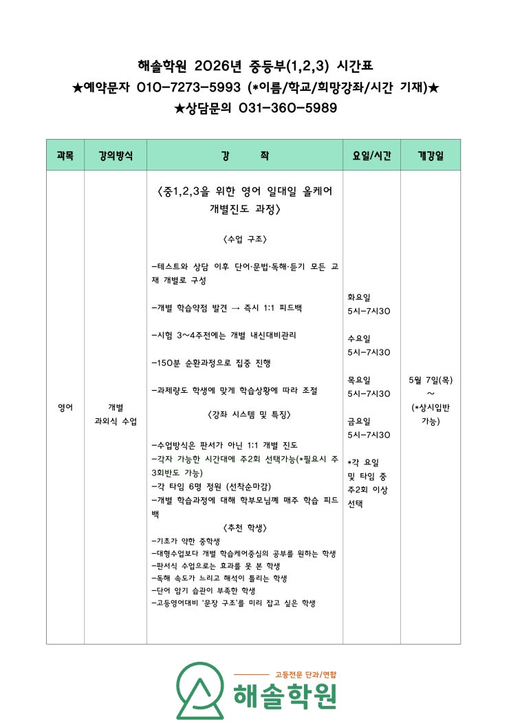 - 해솔학원은 학교별 타겟팅 강좌부터 중등,고등부 개별과외식 집중관리수업, 클리닉과 판서수업이 병행되는 수학집중반, 고3/n수생을 위한 수능전문반 등 학생들이 원하는 수업을 다각화시켜 수업이 진행 됩니다. - 어느 수업이든 공통적으로 재원생들의 학습케어에 포커스를 맞추어 진행되기 때문에 강의와 컨텐츠 뿐만 아니라 학생 개인별 관리(클리닉 및 첨삭, 학습상담)에 주력을 다합니다. - 반별 정원마감은 예약순 입니다. - 시간표는 상황에 따라 약간의 변동이 있을 수 있습니다. - 고입,대입관련 입시컨설팅, 추가적인 개별 및 팀수업은 별도 문의바랍니다. - 수업상담 및 내원은 내선번호로 연락주시면 상세히 안내해 드리겠습니다. ....... <img src="https://blogthumb.pstatic.net/MjAyNjA0MjZfMTA4/MDAxNzc3MTc1NzE3MjU0.hfrwW8VcKVh5bl86THuK8WCXDevzI2Ude_WNy1wHLMwg.ZslS5pNuGr2Gdt_qAFMDu6HHd1CLg6Uo7I_ICPhycwMg.JPEG/26.5%BF%F9_%C7%D8%BC%D6%BD%C3%B0%A3%C7%A5_page-0001.jpg?type=s3" />