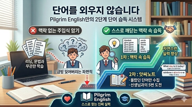 오늘도 단어를 외웠는데… 왜 기억이 안 날까요? 많은 아이들이 단어를 열심히 외웁니다 하지만 - 막상 문장을 만들 때 - 리딩을 할 때 떠오르지 않습니다. 왜 이런 일이 생길까요? 단어를 ‘외웠기’ 때문입니다 Pilgrim English는 단어를 외우게 하지 않습니다 필그림 영어에서는 단어를 무작정 외우게 하지 않습니다 왜냐하면 맥락 없이 외운 단어는 기억에 오래 남지 않기 때문입니다 그래서 우리는 리딩 문법 문장 만들기 아이들이 배우고 있는 내용 안에서 단어를 학습시키는 것을 가장 중요하게 생각합니다 단, 예외는 있습니다 영어를 늦게 시작해 기초 단어 자체가 부족한 경우에는 ....... <img src="https://blogthumb.pstatic.net/MjAyNjA0MTdfMjYx/MDAxNzc2Mzg3MTQwODM0.vz_EYETdTyZGyM4YSF2BXHEkcchJ4K__0J4-g2ktEpEg._IGMmFeoGmhhRFTYEaH6eQ_LdJh4MFxoHV7n9lAQBqMg.JPEG/IMG%A3%DF0779.jpg?type=s3" />
