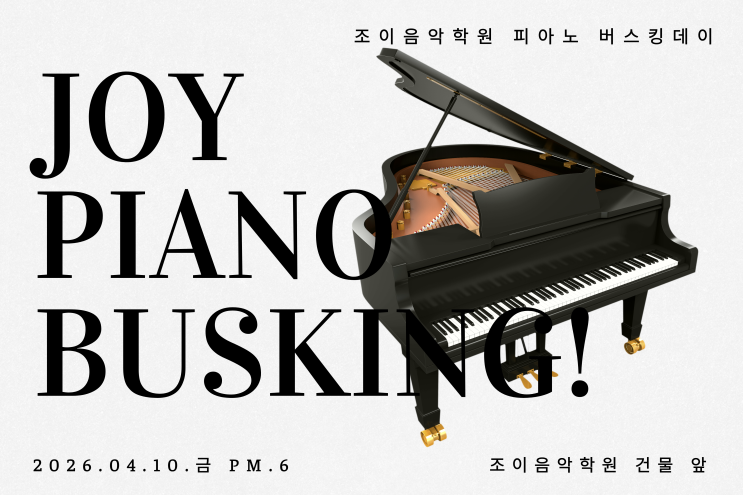 운유초음악학원/운유초피아노학원/장기동음악학원/장기동피아노/김포음악학원/김포조이음악학원 따뜻한 봄바람이 느껴지는 요즘, 아이들이 그동안 갈고닦은 실력을 직접 선보일 수 있는 특별한 버스킹 무대를 준비했습니다. 일시: 4월 10일 (금) 오후 6시 장소: 조이음악학원 건물 앞 이번 무대는 콩쿨을 준비하고 있는 학생들이 그동안 연습해온 곡들을 거리에서 연주하며 아이들의 자신감을 키우고, 음악을 즐기는 시간을 갖기 위해 마련되었습니다. 클래식부터 다양한 장르의 곡들까지, 아이들의 진심이 담긴 연주를 가까이에서 느끼실 수 있는 자리입니다. 학부모님들께서는 물론, 지나가시는 분들도 편하게 들러 아이들의 연주를 함께 즐겨....... <img src="https://blogthumb.pstatic.net/MjAyNjA0MDhfMTY2/MDAxNzc1NjMyMTQ3Mjcy.Pb-dAJpeKllOH9p1l9TInhmfUgcCDY9dl22ooP1kFAkg.lCP_DPT1OFDeFC0fsZDYIoXAA9XYcJbt8LyvguXvWVsg.PNG/%C1%A6%B8%F1%C0%BB_%C0%D4%B7%C2%C7%D8%C1%D6%BC%BC%BF%E4._%287%29.png?type=s3" />
