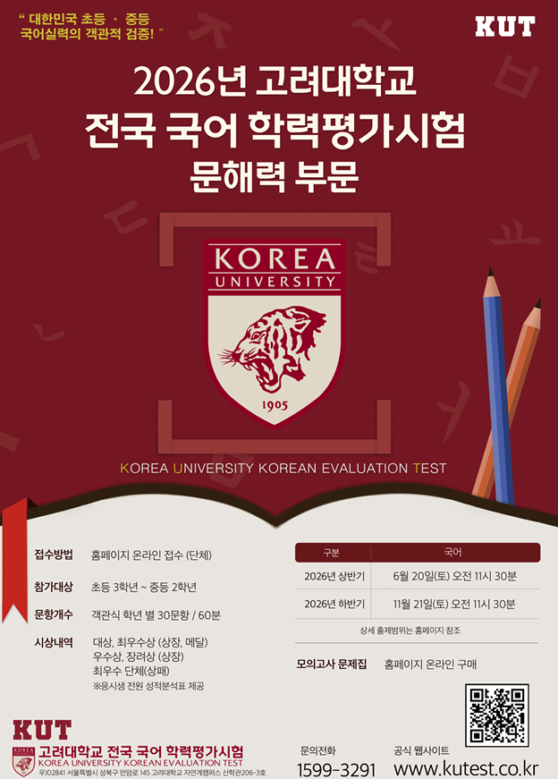 안녕하세요! 웅진씽크빅 지국장 조희주입니다~ #수학 서술형도, #사회나 #과학 개념도 결국 모든 과목의 #기초는 문해력입니다. 우리 아이의 진짜 #국어 실력을 알아보기 위해 #KUT (고려대) 국어 학력평가/경시대회를 소개합니다. ✏️ KUT #국어 학력평가란? 공신력 있는 전국 단위의 평가로, #단순한 #문제 풀이를 넘어 우리 아이의 #어휘력, #독해력, #추론 능력을 #객관적으로 진단해 주는 #시험입니다. 평가 대상 #초등 3학년 ~ #중 2학년 (각 학년에 맞춘 평가지로 진행됩니다.) 우리 아이에게 왜 필요할까요? 정확한 진단 아이의 국어 강점과 약점을 한눈에 파악할 수 있습니다. 바른 방향 설정 결과를 바탕으로 앞으로 어....... <img src="https://blogthumb.pstatic.net/MjAyNjA0MTRfMjQ4/MDAxNzc2MTQyMzAxMDYz.YdZ5Mqq0Tk0uDiToH3FQF8KlZew9j-ohUCTq1WjaAg0g.CaXCiKGjTN0BRxmZERWs5rpPWiD5bn73iaSU7Ab9ITkg.PNG/image.png?type=s3" />