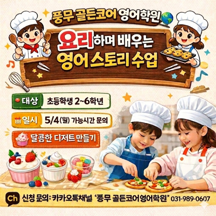 안녕하세요! 풍무 골든코어영어학원에서 올해 어린이날을 기념해서 5/4(월) 쿠킹 클래스를 스페셜하게 준비했습니다. 간단한 디저트 만들고, 관련된 스토리도 배우고, 쿠킹 노래도 신나게 불러보는 시간을 가집니다. 한정된 좌석으로 인해 "카카오톡채널"을 통한 문의 및 신청 서둘러주세요~! 학원에 대한 정보는 아래 링크 클릭해 주세요. 아래 카카오톡채널을 통해서 문의 바랍니다~! 감사합니다! <img src="https://blogthumb.pstatic.net/MjAyNjA0MThfMTUy/MDAxNzc2NTAyMzE5OTcw.mZVIx9pWgVa-prlm5nmVqhmZT1ET96xfSGJznzYo4Zkg.y-Coel3D9Z5iQHBqJBhySIGxVW00Js8JrXhtoDnB5e4g.PNG/%C4%ED%C5%B7%C5%AC%B7%A1%BD%BA.png?type=s3" />