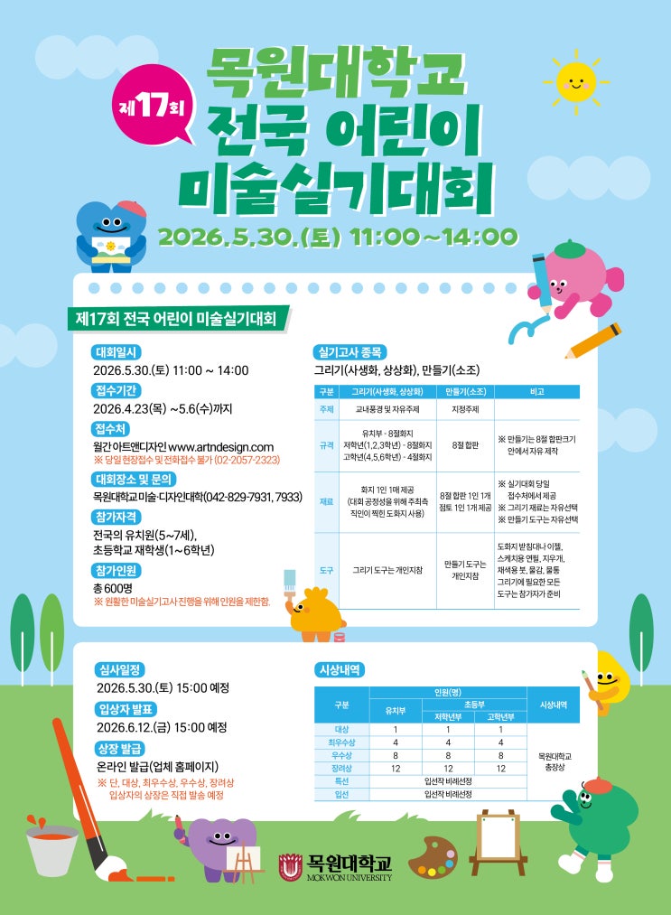 제17회 전국 어린이 미술실기대회 미술·디자인대학에서는 아래와 같이 전국 어린이 미술실기대회를 개최합니다. 많은 관심과 참여 부탁드립니다. 접수처 : 월간 아트앤디자인 www.artndesign.com 접수기간 : 26.4.23.(목) 00:00 ~ 26.5.6.(수) 24:00 문의사항 : 042-829-7933, 8340 | 참가자격 전국의 유치원(5~7세),초등학교 재학생(1~6학년) 참가인원 총 600명 ※ 원활한 미술실기고사 진행을 위해 인원을 제한함 | 접수기간 2026년 4월 23일(목) 00:00 ~ 5월 6일(수) 24:00 | 접수처 월간 아트앤디자인 | 참가비 없음 | 실기고사 종목 그리기(사생화,상상화), 만들기(소조) | 시상내역 https://www.mokwon.ac.kr/kr/html/sub06/0605.html?mode....... <img src="https://blogthumb.pstatic.net/MjAyNjA0MjNfMjUx/MDAxNzc2OTI0OTY0NDY2.tDpQZFMZKOvcvileeHjQfeuTBsUZqhypYHVwmYpUD6Ig.VNRlVhtYcF2XQM9W2j3pBKCDWnnHCLxbd1fkZU1hapkg.JPEG/%B4%EB%BF%DC%B9%DF%BC%DB%BF%EB%2B%C6%F7%BD%BA%C5%CD.jpg?type=s3" />