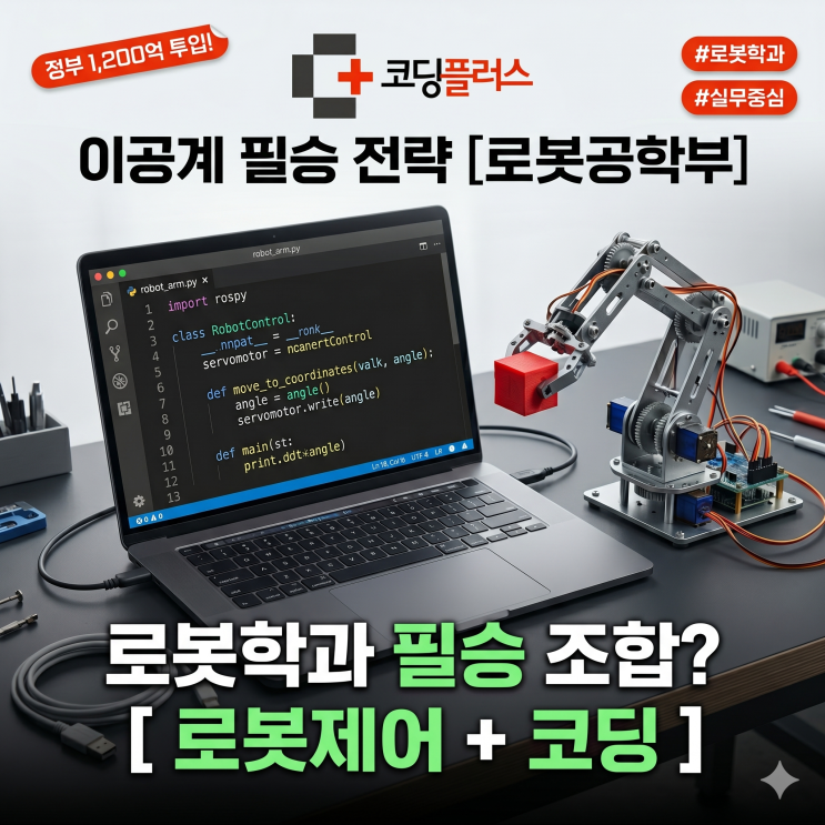 제5493호, 제3398호 안녕하세요, 코딩플러스입니다. [1편] 산업보안, [2편] 반도체 공학부에 이어 오늘 다뤄볼 주제는 이공계 지망생들의 영원한 워너비, 로봇공학부입니다. 멋진 로봇이 움직이는 모습에 반해 로봇공학자를 꿈꾸는 아이들이 많죠? 하지만 실제 대학 강의실에서 벌어지는 일은 조금 다릅니다. 나사를 조이는 시간보다 컴퓨터 앞에서 코드를 짜고 에러를 잡는 시간이 훨씬 길기 때문입니다. 로봇의 '근육'은 기계, '뇌'는 코딩입니다 로봇공학은 흔히 기계, 전자, 소프트웨어의 결합이라고 합니다. 여기서 핵심은 기계라는 하드웨어에 '생명(지능)'을 불어넣는 작업이 바로 코딩이라는 점입니다. 장....... <img src="https://blogthumb.pstatic.net/MjAyNjA0MTRfMjIw/MDAxNzc2MTQ4MTQ2MDUw.i2yHMYB9pSgUs20Yc9yN91GAdU-GEGlde-b6EIrKkBYg.EnqsqggNF6fTUpXvGKfguyBOexgIYAwu3mC5lC0mH3Yg.PNG/Gemini_Generated_Image_3ye5x23ye5x23ye5.png?type=s3" />