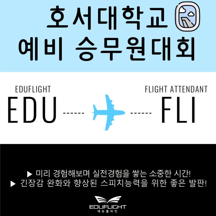 안녕하세요! 에듀플라잇 승무원학원입니다:) 이제 예비 승무원대회가 하나둘씩 개최될 시기입니다! 이에 호서대학교 예비 승무원대회 소식을 들고왔습니다. 호서대학교 예비승무원대회 호서대학교 항공서비스학과 인스타그램 @hoseo_airline 지원대상 : 전국 고등학생(2, 3학년 & N수생) 서류 통과자 150명 접수일정 : 2026.04.10(금) ~ 05.09(토) 19:00 본선 진출자 발표 : 2026.05.13(수) ~ 14(목) 19시 전후 (카카오톡 or 개별문자) 대회 본선일 : 2026.05.23(토) 09:00 ~ 17:00 호서대학교 예비승무원 참가 내용 모의면접과 개별 피드백(면접관 교수님), 기내서비스, 안전데모, 조주기능사 체험, 재학생과의 멘토링, 면접 이미지메이킹, ....... <img src="https://blogthumb.pstatic.net/MjAyNjA0MjVfMjY5/MDAxNzc3MTAyNDUzOTQw.yGWxLhrMIytl0G54A7B0Cv5PeGrc68kCMbdB4xEgeY4g.2VGQdLo_PgZcy3A8eipcdOPq7TzLmjkHmxV3qti2P54g.JPEG/%C8%A3%BC%AD%B4%EB.jpg?type=s3" />