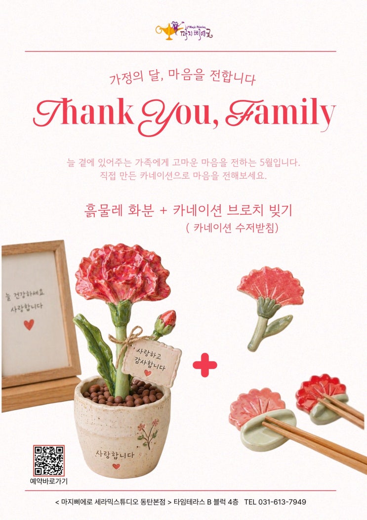 안녕하세요 마지삐에로 도자기입니다. 늘 곁에 있어주는 가족, 스승님 등 고마운 마음을 전하는 5월 가정의 달입니다. 어떤 선물을 할지, 매년 똑같은 카네이션? 특별한 선물을 찾고 계신분들게 추천드립니다. 마음을 담은 카네이션 화분 외에 카네이션 브로치+수저받침을 직접 만드는 체험입니다. < 도자기 체험은 세 가지 중에서 선택할 수 있습니다.> 1. **물레체험** 전통 기법인 물레로 도자기를 빚는 과정입니다. 강사의 1:1 지도로 기본을 배우고 자유롭게 제작하며, 반건조된 카네이션화분에 문양을 꾸밉니다. 2. **흙 빚기 체험** 흙으로 카네이션 브로치 (수저받침) 도자기를 만드는 수업으로, 매 수업 내용이 변경될 수 있습니....... <img src="https://blogthumb.pstatic.net/MjAyNjA0MjZfMTk5/MDAxNzc3MTkwMzMyNDI5.QTmbYxGizN-80H49JJXA3y-YtSIEYPZv1sy0BkZcbcQg.9XnCOi8ww7IFV-1336QO26OlgiF7th153PMhBZkg2bgg.JPEG/%C4%AB%B3%D7%C0%CC%BC%C7_%BA%FA%B1%E2%2B%C8%EB%B9%B0%B7%B9%C3%BC%C7%E8_%281%29.jpg?type=s3" />