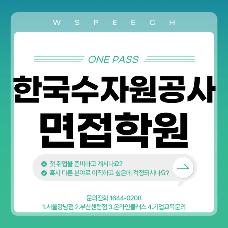안녕하세요! 공기업면접학원 우지은 W스피치입니다. 공기업 취업을 준비하시는 분들이라면 한 번쯤 반드시 고민하게 되는 곳, 바로 한국수자원공사 입니다. 단순히 “좋은 회사”를 넘어 직무 전문성과 안정성, 공공성을 모두 갖춘 기관이기 때문에 경쟁률이 높은 만큼 면접에서 당락이 결정되는 구조입니다. 오늘 글에서는 채용 구조, 기업 분석, 면접 기출 + 답변 예시, PT 면접 전략까지 실전 중심으로 정리 해드리겠습니다! 1. 한국수자원공사 채용 한눈에 보기 ✅원서접수: 26. 4. 30.(목) ~ 5. 8.(금) 14:00 ✅채용 규모: 총 207명(행정 51명 / 기술직 156명) ✅근무 조건: 연봉 약 4,100만 원 (성과급 별도), 주 5일 / 40시간, 3개월 수....... <img src="https://blogthumb.pstatic.net/MjAyNjA0MjhfMjU3/MDAxNzc3MzQxNjkwOTY3.gUL8AAaAXmrifZ13ohrM7Ees8uQ5AzPyIxaliVEVRF0g.NmpkPjWiMbSPR90Dgi6Ufe237rWJLJxtsEqPgWQkdnwg.PNG/1.png?type=s3" />