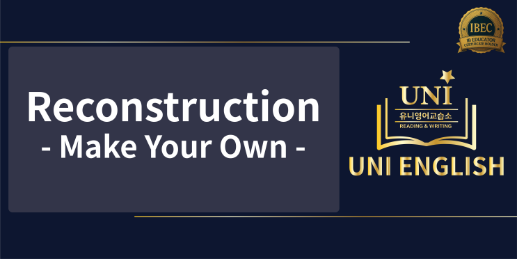안녕하세요 유니영어교습소 Uni English 입니다. 관점 전환을 통해 생각을 하기 시작하고, 구조화를 통해 글의 형태를 만들고, 연결을 통해 글의 깊이를 더했다면, 마지막으로 필요한 것은 Reconstruction, 즉, 글의 재구성 입니다. 관점 전환 - 구조화 - 연결을 통해 글을 완성하는 것도 큰 일이에요. 쉽지 않은 일이거든요. 하지만, 이렇게 글을 쓰다보면 어느 순간 이상함을 느끼기 시작하는데요. 글의 다양성이 줄어들고, 어떤 글을 써도 비슷하게 보이고, 결정적으로 너무 익숙하게만 느껴지는 것이죠. 이 익숙함을 느끼기 시작했다면, 이제 다음 단계로 넘어갈 준비가 된거에요. 익숙함을 느끼는 이유는 간단합니다. 글을 이해 했지만, 아....... <img src="https://blogthumb.pstatic.net/MjAyNjA0MjdfMjY5/MDAxNzc3Mjc5OTY3Njkx.QTkWZ7hRZ7e-PCBtY3cG8wTiG7nOTmTf6kgQRp-xJf0g.fpyeO4K_BxD3mWFz0JHmpvqs3TMXC290_A8quIL1alcg.PNG/%C0%E7%B1%B8%BC%BA.png?type=s3" />