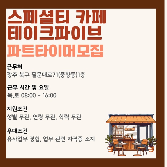 안녕하세요. 광주커피바리스타학원입니다. 스페셜티 카페 테이크파이브에서 평일&주말 파트타이머를 구하고 있어 안내 해 드립니다. 근무요일 및 시간: 목,토 08:00-16:00 (요일,시간 협의 가능) ✅지원조건: 성별,연령,학력무관 ✅우대조건: 유사업무 경험, 업무 관련 자격증 소지 ✅업무내용: 음료제조 및 판매, 매장관리 구인공고 관심 있으신 분들은 위 공고 클릭해서 내용 확인 후 온라인지원, 문자지원 하시면 됩니다 :) 빠르게 마감될 수 있으니 서두르시기 바랍니다~ <img src="https://blogthumb.pstatic.net/MjAyNjA0MTVfMTE3/MDAxNzc2MjEzMDQyNzAw.izXRCK8ZPpBFR71jiI_ow0_G3LqhLOyT6n6dKMXOIWsg.BPIewcX4CqUhho7C8-O1ZAminm2Ox3ZClgKD993sVuAg.JPEG/2604%C5%D7%C0%CC%C5%A9%C6%C4%C0%CC%BA%EA.jpg?type=s3" />
