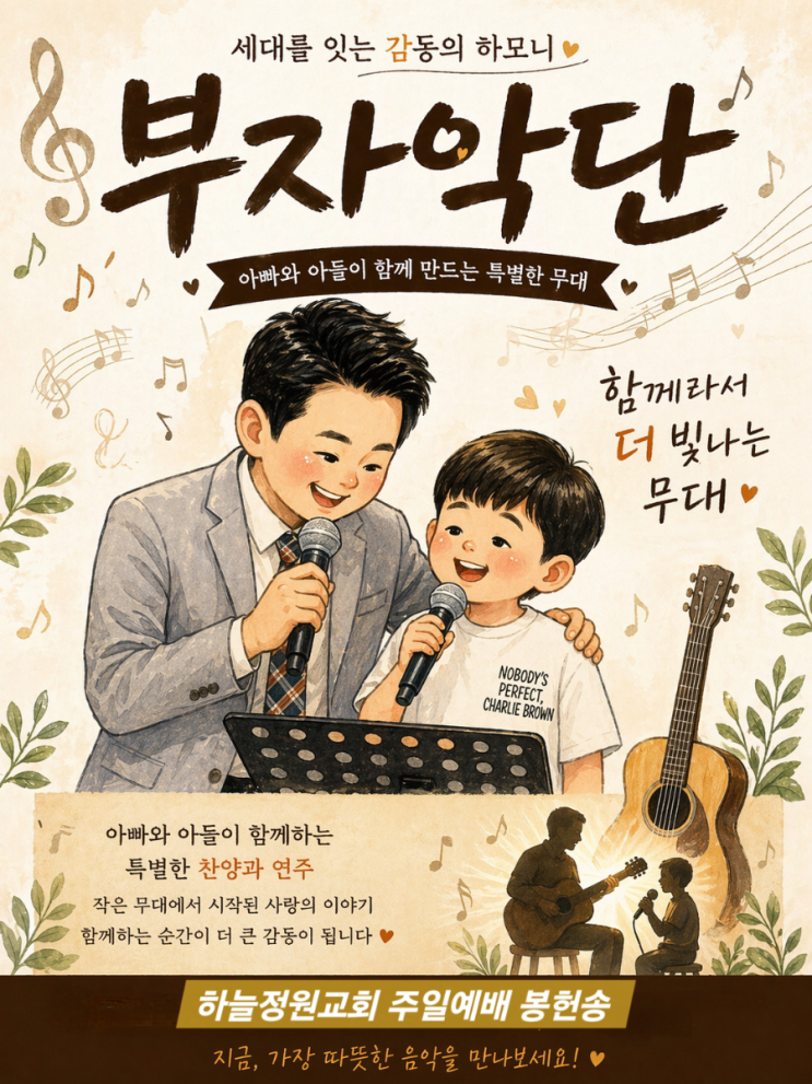 대전 아빠와 아들 부자악단 주일 봉헌찬양 길을 만드시는 주 하늘정원교회 하모니 대전 유성구 하늘정원교회 주일예배시간 아빠와 아들이 함께 무대에 서서 봉헌 특송을 찬양을 올려드리는 순간으로 준비되어 찬양이 시작 되었습니다. 이날 찬양은 영화로 "신의악단" 으로 큰 사랑을 받으며 많은 이들에게 잘 알려진 곡 "길을 만드시는 주" 입니다. 이미 많은 국민 시민분들에게 은혜를 전해온 찬양시지만 이날 하늘정원교회 주일예배 가운데서는 더욱 깊은 감동이 감돌았습니다. 특히 부자악단 아빠와 아들이 함께여서 더 특별한 찬양으로서 그 자체만으로도 큰 의미를 전해 주었습니다. 서로의 호흡을 맞추며 한 마음으로....... <img src="https://blogthumb.pstatic.net/MjAyNjA0MjZfMjE5/MDAxNzc3MTgwMDAwODcx.xuzbRdpuat4eIjB2S_hI6D6iH03EHXW-lwenemulvHYg.422QXnyqaQRTn07rC8JFMu-QYZseCYmWanK2maTDD4og.PNG/900_file_000000009ff8720bb240792a2d72916e.png?type=s3" />