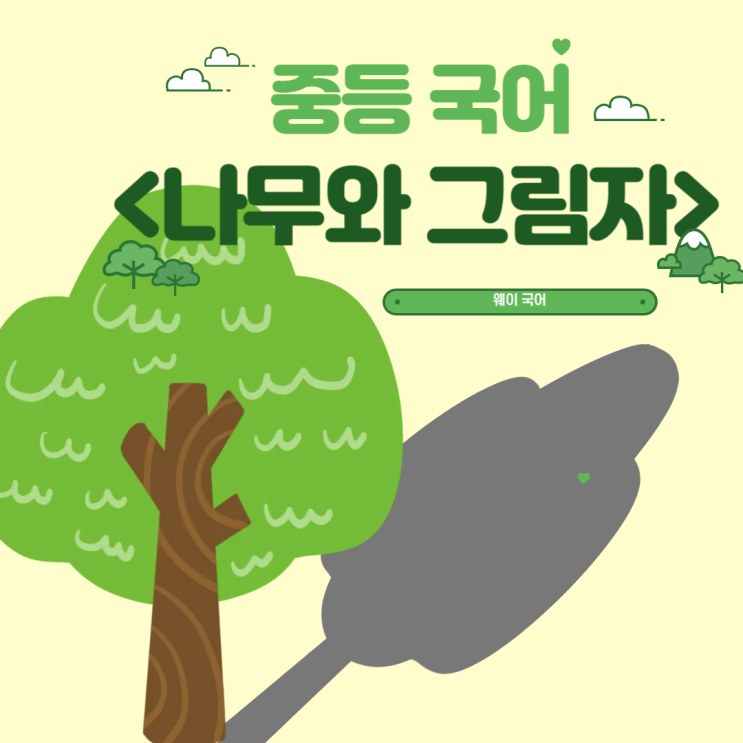 안녕하세요. WAY 학원입니다. 오늘은 중2 국어 미래엔(민) 교과서 1단원에 실린 [나무와 그림자]를 포스팅해 보겠습니다. [나무와 그림자]는 '나무'를 화자로 내세우고 있습니다. 어느 날 '나무'의 앞을 가로막는 벽이 생기고 나무는 그 벽에 자신의 그림자가 비치는 것을 보게 됩니다. 일반적으로 '벽'은 무언가를 가로막는 부정적인 대상으로 인식되지만 화자는 벽을 자신의 그림자를 마주 보게 해 준 긍정적인 대상으로 인식합니다. 이러한 화자의 태도를 통해 부정적으로 여겨질 수 있는 상황에서 긍정적인 의미를 발견하는 태도라는 시의 주제를 전달하고 있습니다. 웨이티의 필기를 보면서 더욱 자세히 알아....... <img src="https://blogthumb.pstatic.net/MjAyNjA0MjhfMjEg/MDAxNzc3Mzc4NjI5NzQ1.xJEft4zJXmeVGYRrRCd7oA8KvFq5ES30jJz3zXn7TMkg.ZZPcilqyFCbheRgr9I260Xj076yca8k8RPV9VyOglPQg.PNG/%C1%A6%B8%F1%C0%BB_%C0%D4%B7%C2%C7%D8%C1%D6%BC%BC%BF%E4_-001_%287%29.png?type=s3" />