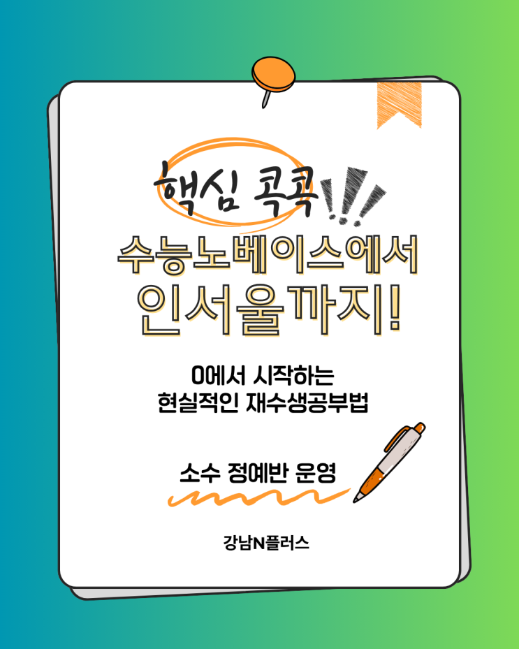 수능 노베이스에서 인서울까지 — 0에서 시작하는 재수생의 현실적 공부법 "저는 진짜 노베이스인데, 지금 시작해도 인서울 갈 수 있나요?" 재수학원 상담실에서 해마다 듣는 질문입니다. 검정고시를 막 통과한 학생, 고교 3년간 공부를 거의 손 놓았던 학생, 수능 전 과목 7~9등급으로 졸업한 학생. 출발점은 다르지만 공통점은 같습니다. 기초가 거의 없는 상태에서 11월 수능까지 남은 시간 안에 인서울을 목표로 해야 한다는 것. 결론부터 말씀드리면, 가능합니다. 다만 아무렇게나 해서는 안 됩니다. 노베이스에게는 노베이스만의 공부법이 있습니다. 노베이스, 생각보다 많습니다 "노베이스"라고 하면 특수한 경우라고....... <img src="https://blogthumb.pstatic.net/MjAyNjA0MjRfMjIg/MDAxNzc2OTg2NzY4MDg2.bbErRf1v-vdPiVXbks4txO_N4fV672_BlnjtxBxT4tUg.SLCpm3L0_OYVxck0yxcVjNHGCcPk2nZV48cWGG2zVLYg.PNG/%BF%AC%B3%EB%B6%FB_%C1%D6%C8%B2%BB%F6_%B1%F2%B2%FB%C7%D1_%BF%B5%BE%EE_%C7%D0%BF%F8_%C6%AF%B0%AD_%C8%AB%BA%B8_%C0%CE%BD%BA%C5%B8%B1%D7%B7%A5__%C6%F7%BD%BA%C6%AE_%284%29.png?type=s3" />