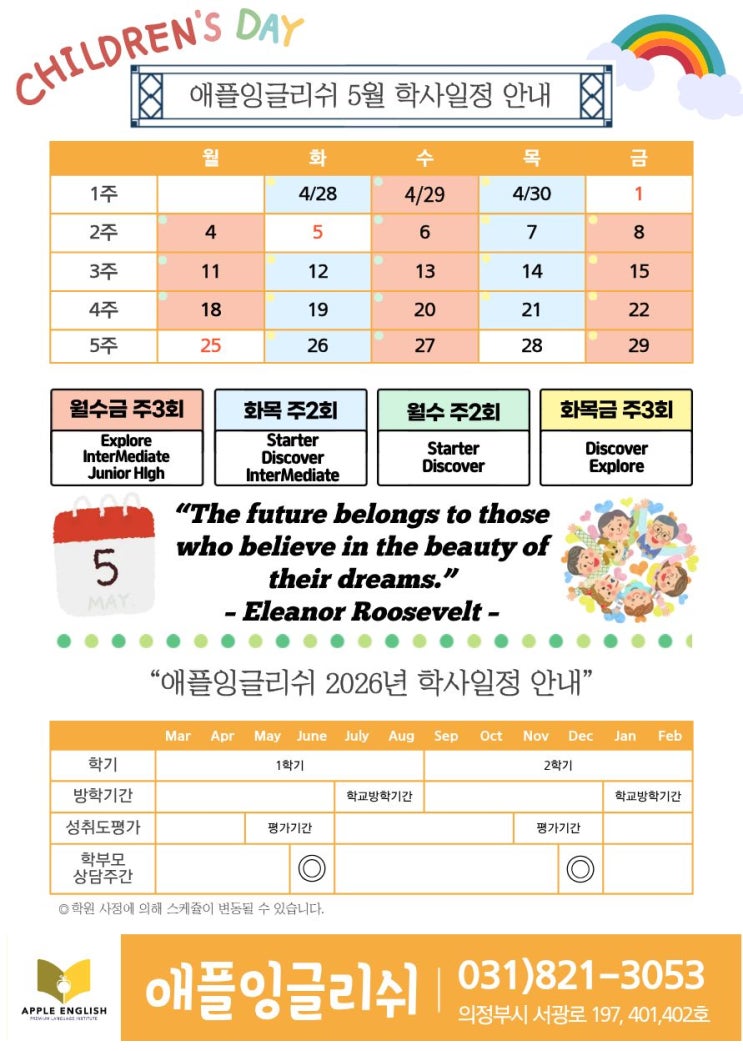 의정부 고산 애플잉글리쉬 5월 학사일정 안내
