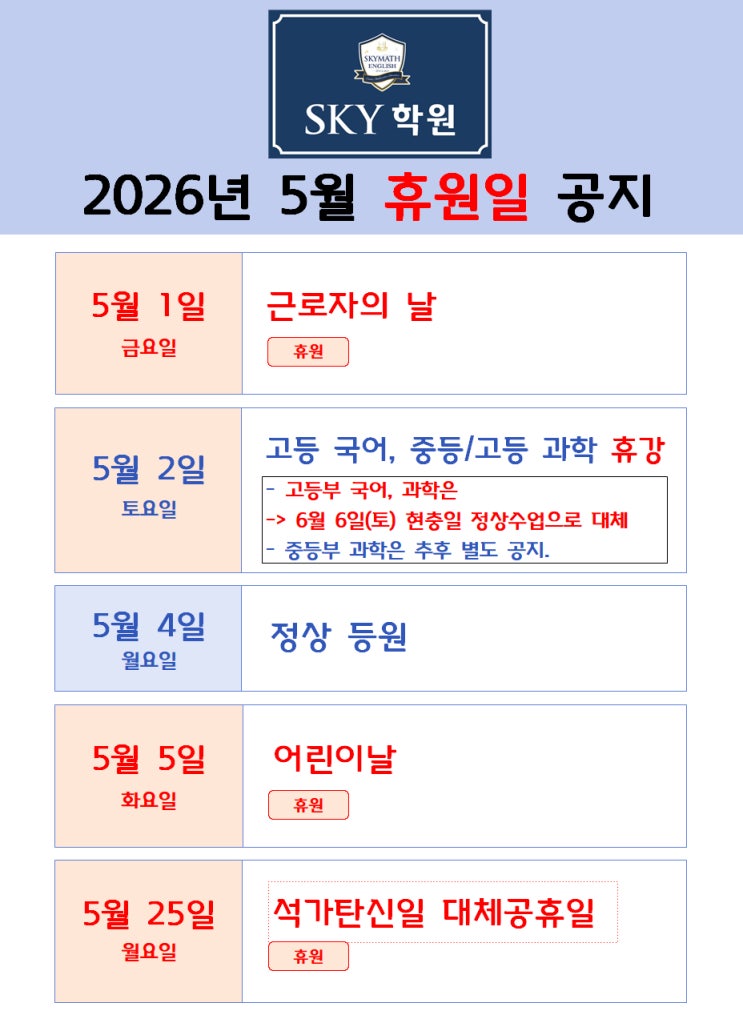 안녕하세요~ 소비루미샘입니다. :D 5월 학사일정을 안내드리오니 참고 부탁드리며, 신규 입회를 희망하시는 학부모님께서는 5월 첫째주까지 문의 주세요~ <img src="https://blogthumb.pstatic.net/MjAyNjA0MzBfMTM4/MDAxNzc3NTA4MjY1NDEy.0ulGZ407YoErTXMKacQl0gWiZt6dd5nagy-XF3zTqkkg.VfZKG5QZZmfNFKOYnYdV_Qjeh-7iE0a1hyARVFyiqDsg.JPEG/5%BF%F9_%C7%D0%BB%E7%C0%CF%C1%A4.jpg?type=s3" />