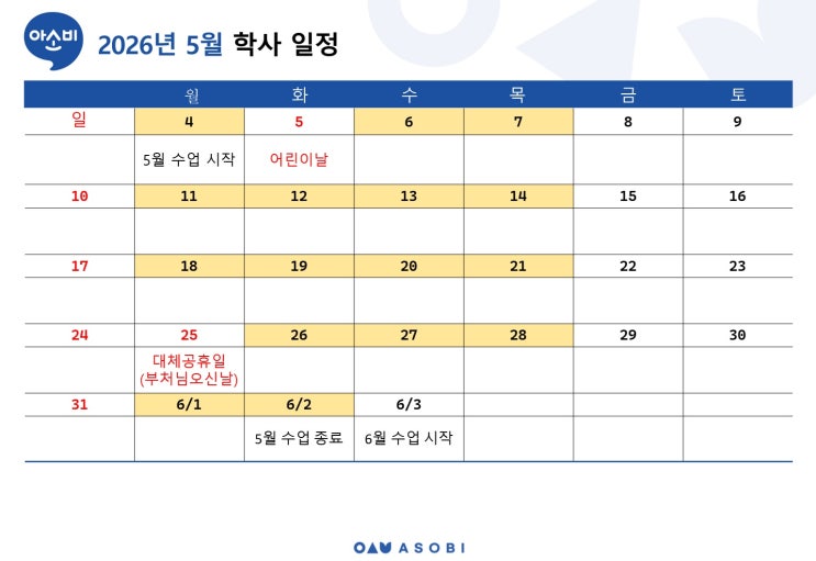 안녕하세요~ 소비루미샘입니다. :D 5월 학사일정을 안내드리오니 참고 부탁드리며, 신규 입회를 희망하시는 학부모님께서는 5월 첫째주까지 문의 주세요~ <img src="https://blogthumb.pstatic.net/MjAyNjA0MzBfMTM4/MDAxNzc3NTA4MjY1NDEy.0ulGZ407YoErTXMKacQl0gWiZt6dd5nagy-XF3zTqkkg.VfZKG5QZZmfNFKOYnYdV_Qjeh-7iE0a1hyARVFyiqDsg.JPEG/5%BF%F9_%C7%D0%BB%E7%C0%CF%C1%A4.jpg?type=s3" />
