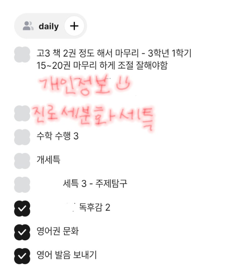 시험 기간, 아이들도 바쁘지만 제 책상 위도 이미 포화 상태입니다. 현재 진행 중인 가이드 리스트 1. 수학 수행 3개 가이드: 단순 계산이 아니라 수식의 논리적 흐름과 수학적 타당성을 잡아 탐구의 질을 높이는 중입니다. 2. 주제탐구 세특 3개 밀착 코칭: 학생의 진로에 맞춰 깊이 있는 탐구 주제를 설계하고 완성도를 높입니다. 3. 프로젝트 기반 독후감 2개: 이게 제일 핵심입니다. 그냥 독후감이 아니라 세특의 근거가 될 심화 독서를 제가 직접 선별하고 논리를 연결해주고 있습니다. 4. 고3 도서 리스트 관리: 1학기 마무리를 위해 15~20권의 독서 이력을 학생별로 조율 중입니다. 많은 분이 묻습니다. 원장님이 왜 그렇게까지 직접....... <img src="https://blogthumb.pstatic.net/MjAyNjA0MjZfMzQg/MDAxNzc3MTkyOTUyNTgy.4FYCFgDn-Ov6wyjI8RwFYBokpfFZ5lsdWAEqPj5pQSIg.rT25j4lc_fXbSqKl4KRRLmRgo_VN-OlnVZdR15gp5OUg.JPEG/900_Screenshot_20260426_173007.jpg?type=s3" />