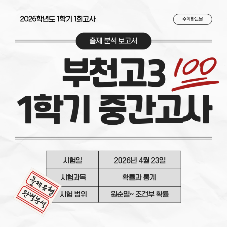 안녕하세요, 수학하는날입니다. 부천고 3학년 확률과 통계 시험이 끝났습니다. 실제 시험지를 기반으로 시험지 분석과 추후 분석까지 들어가 보겠습니다. 시험 구조와 난이도 분석 부천고 3학년 확률과 통계는 전체 문항 20문항 중 선택형 14문항, 서술/논술형 6문항으로 출제되었습니다. 단순 공식 암기가 아닌 ✅ 복합적인 조건을 해석하는 서답형(1-3번)과 논술형 3번 같은 고난도 조건 해석 문제를 해결하는 것이 변별 포인트가 됐습니다. 핵심 전략 난이도 하 문항으로 구성된 초반부에서 점수를 확보하고 고난도 문항을 해결할 시간을 만드는 것이 필요한 시험이었습니다. 단원별 출제 비중 분석 ✔️ 확률의 뜻과 활용 단원 최다 문항....... <img src="https://blogthumb.pstatic.net/MjAyNjA0MjdfMTQz/MDAxNzc3MjgxMzgwNjc4.94xNfdVI23ooG_uCq0puJtkZWEuNzHkPqcjnZ2ZVKd4g.o7o6PC3yeXKRmxGYi2wCS14inM5ReOeNytKPrRb5fPkg.PNG/1.png?type=s3" />