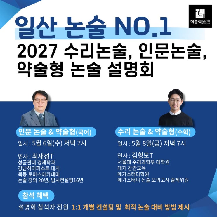 #일산수리논술 #일산인문논술 #일산약술논술 같은 시간을 공부해도 결과가 갈리는 이유, 알고 계십니까? 수능만으로 부족한 순간, 논술이 합격을 바꾸는 결정적 변수가 됩니다. 그래서 이번 설명회에서는 단순 정보 전달이 아닌 대학이 실제로 뽑는 답안 기준 수리, 인문, 약술 논술의 차이 학생별 현실적인 전략을 명확하게 제시합니다. 예약 및 문의 인문논술&약술형(국어) 5월6일(수) 저녁 7시 수리논술&약술형(수학) 5월8일(금) 저녁 7시 대치동 실전 강사가 직접 공개하는 /논술 합격 전략 설명회/ 2027학년도 수리, 인문 논술 및 약술형 논술 전형 요약 -대학별 전형 분석과 시기별 논술 준비 로드맵 -인서울 대학을 가기 위한 최....... <img src="https://blogthumb.pstatic.net/MjAyNjA0MjhfMjU3/MDAxNzc3MzYxODQ4OTY5.hfooa5yOjDIlMKiXk9N-KLX4vZBjI3RnzPZU_UhZG30g.DTsflhQA76Vb6NVKV0C1-EjPrM_33B3JT05oCnpG6ZMg.JPEG/%B3%ED%BC%FA_%BC%B3%B8%ED%C8%B8.jpg?type=s3" />