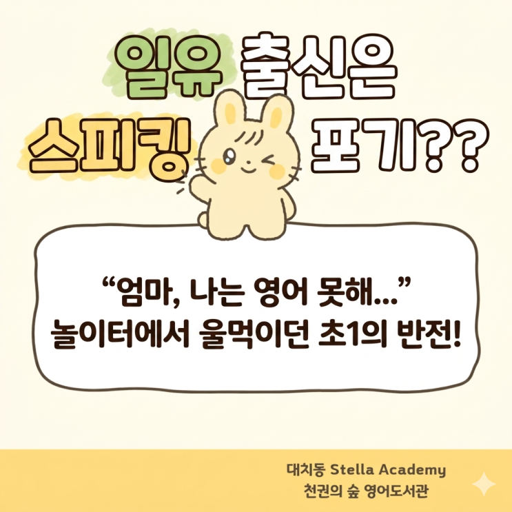 일유 출신은 스피킹 유창성 포기해라?? 초1의 놀라운 반전! 안녕하세요, 대치동 스텔라 극상위 영어, 천권의 숲 영어도서관 입니다. 상담을 하다 보면 가장 많이 듣는 안타까운 질문이 있습니다. "우리 아이는 일반 유치원(일유) 출신에 이제 막 영어를 시작해서 SR 점수도 낮은데... 영유 애들처럼 말하기는 힘들겠죠?" 오늘 그 편견을 완전히 깨뜨린 저희 스텔라 아카데미의 초등학교 1학년 학생 이야기를 들려드리려고 합니다. "엄마, 나는 영어 못해..." 놀이터에서 풀 죽어있던 아이 불과 한 달 전만 해도 이 친구는 놀이터에서 친구들이 영어로 신나게 대화할 때 곁에서 지켜 보며 속상해했다고 해요. 우리 친구....... <img src="https://blogthumb.pstatic.net/MjAyNjA0MTdfMTk0/MDAxNzc2NDE4OTA1OTU4.mkrV6rQb2hGHmOqaPc1h4sZbUUj-EBN29Z5VuuLGD8cg.RRuKrcVG2gKLb0PNOO-JcmNRBiPhyFrspI5yyYRfQ-Ug.PNG/Gemini_Generated_Image_3dcelc3dcelc3dce.png?type=s3" />