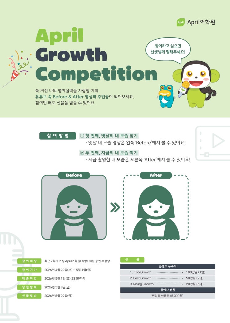 안녕하세요. 에이프릴 학생들의 성장한 모습을 영상으로 담는 April Before & After Growth 캠페인 안내드립니다. April어학원에서 성장한 실력을 영상으로 촬영 후 제출하면 참여자 전원에게 ' 편의점 상품권 (5,000원) ' 을 드립니다. 여러분의 많은 참여 부탁드립니다! * 영상촬영은 수업시간 전 또는 쉬는시간에 학원에서 진행될 예정입니다 * * 4/25(토) 촬영이 가능하신 분은 13:00~14:30 까지 개별등하원 부탁드립니다. * 촬영동의서는 학생을 통해 전달 드리겠습니다. 수기 작성 후 학원으로 제출 부탁드립니다. 촬영 내용: 수업시간에서 배운 내용을 암기 후 영어 말하기 참여기간: 4월 22일(수) ~ 4월 28일(화) 까....... <img src="https://blogthumb.pstatic.net/MjAyNjA0MjNfMjc5/MDAxNzc2OTExNjEzODY3.ZwA9HMsxeOi4jcphNaFVF8gMAfdmV-k2VblVUOdCmfIg.DOUNeTXSTfgno-nCVNTIvVNcJgWAA6XS_Llsr87P3CAg.JPEG/April_Growth_Competition_%C6%F7%BD%BA%C5%CD_%C8%AE%C0%CE%BF%EB.jpg?type=s3" />