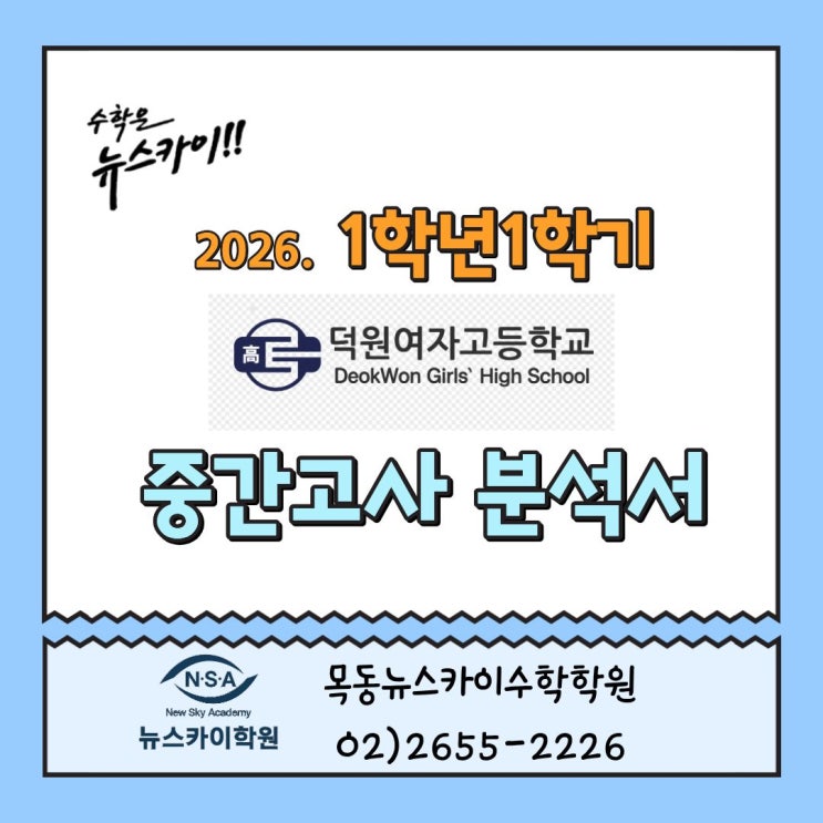 안녕하세요 목동뉴스카이수학학원(02-2655-2226)입니다 4월23일 자로 #덕원여고 1학년 1학기 중간고사 수학시험이 끝났습니다 고등학교 진학해서 처음 맞이하는 시험이라 많이 긴장되고 떨렸을 것으로 생각됩니다 그럼 시험은 어떤 유형의 문제와 난이도로 출제 되었는지 보겠습니다 덕원여고 1학년 1학기 중간고사 분석 1. 분석대상 덕원여고 1학년 2. 난이도 및 유형분석 하: 6문항 (25%) 중: 5문항 (21%) 상: 13문항 (54%) 상 난이도 비중이 절반 이상으로 변별력 중심 시험 3. 단원별 출제문항 ✔ 다항식 출제수: 10문항 객관식 1 / 주관식 1 출제내용: 다항식 연산, 다항식 나눗셈 계수비교, 항등식 활용 인수분해 및 활용 나머지....... <img src="https://blogthumb.pstatic.net/MjAyNjA0MjNfMjgg/MDAxNzc2OTMwMjMxMjgw.HVWouHw1MS8fcjLBekKrvhigQsbHexQwSA4d-K_DghIg.g_BRl6tgpVvXeutvPinJW4IGEi-yvtmLrF0cPUL6Szwg.JPEG/%C1%A6%B8%F1%C0%BB_%C0%D4%B7%C2%C7%D8%C1%D6%BC%BC%BF%E4._%2836%29.jpg?type=s3" />