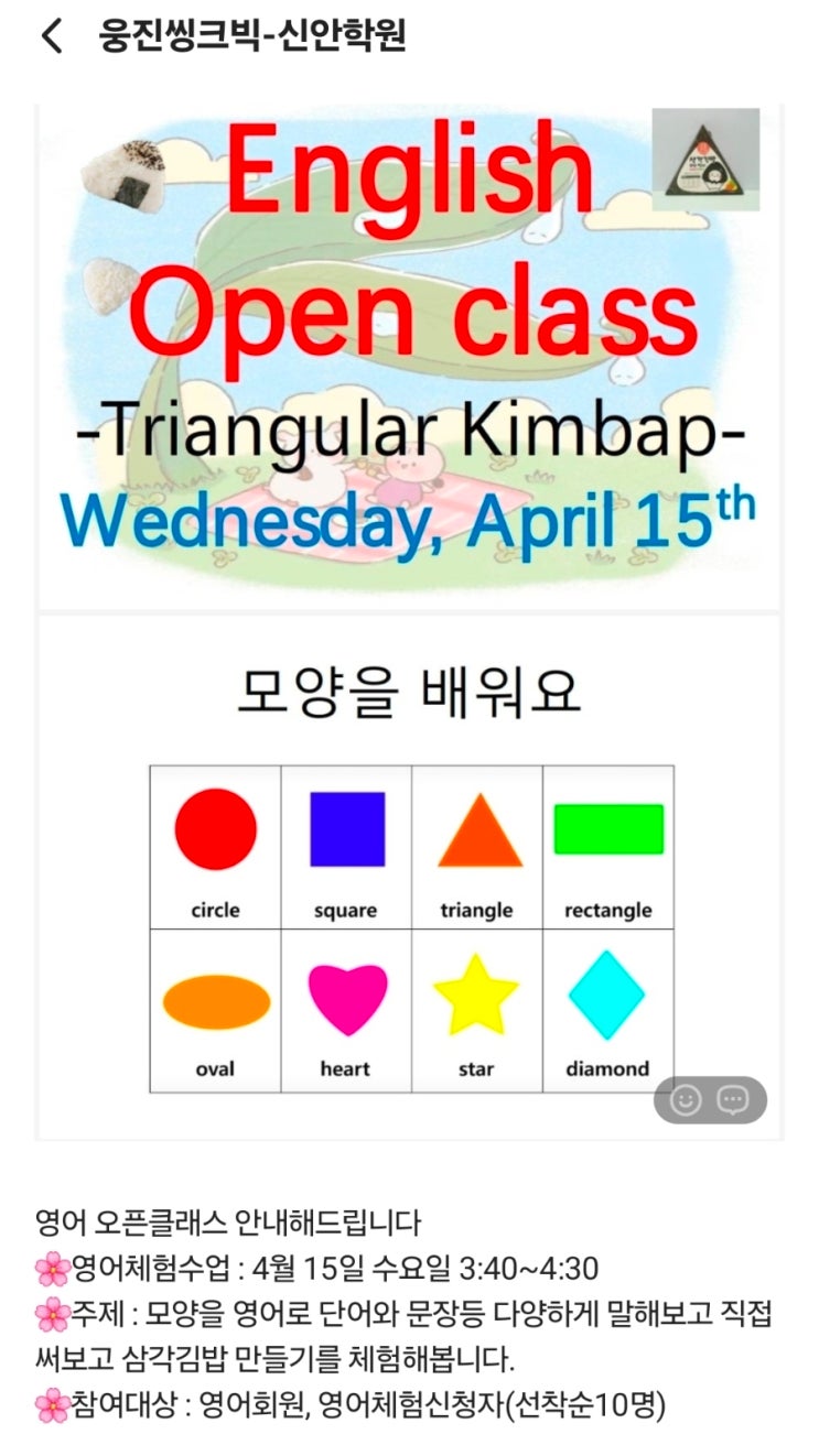 영어체험수업은 친구들과 함께 배운영어를 체험활동을 통해 발화해 보고 표현해보는 체험학습이에요~ 신안동 소재의 신안학원은 삼각김밥만들기 영어수업 충무공초 옆 사들학원에서는 딸기모찌 만들기 영어수업 <우리 초등친구들 작품> 우리 친구들은 영어 체험수업 하는 날이면 며칠전부터 설레여하고 이 날만 손꼽아 기다린답니다~ 더불어 우리 중딩이들 시험기간이라 늦게까지 열공해야해서 더불어 간식으로 든든하게 챙겨주었어요~ 웅진신안학원과 사들학원은 공부가 즐거운 학원 정답고 따뜻한 학원 분위기로 우리 아이들이 오고싶은 학원이 되도록 정성껏 지도를 하고 있습니다~ 진주 웅진씽크빅 AI맞춤학습 시스템으로 우리아이....... <img src="https://blogthumb.pstatic.net/MjAyNjA0MjNfMTIw/MDAxNzc2OTUwMTQ4ODM1.iR0NnOCue_zqvlW-EJY523n88MQpiiLvJCl6hLJRUz4g.5mHFqf8f9sUP8loQAc4hbNhBJ-u24BZaGnqDJWK5B-0g.JPEG/900_Screenshot_20260409_111907_BAND.jpg?type=s3" />
