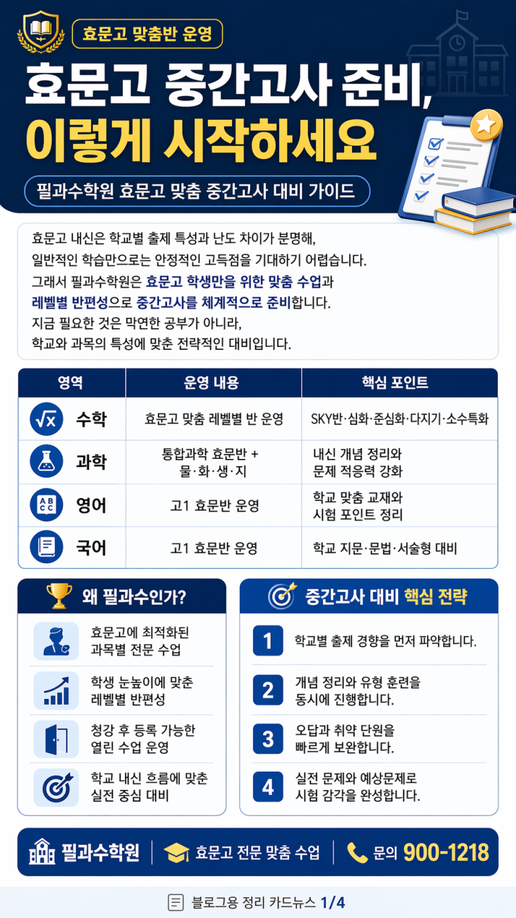 안녕하세요 필과수학원입니다. 오늘은 효문고 준비는 어떻게 되는지 카드뉴스형태로 말씀드려 볼까합니다. 효문은 전교생이 너무 적어 내신을 확보하기가 쉽지 않지만 필과수의 열정적이고 능력있는 샘들과 효문고 학생들로만 구성된 효문전문반으로 1등급의 기회를 꼭 만드시길 바라며~~ 감사합니다. <img src="https://blogthumb.pstatic.net/MjAyNjA0MjNfMTQz/MDAxNzc2OTUwNzE3Njk4.cNyqF5HATFOwAjC4Inii_zBINZvDU-JLG_tN_Ln6TgIg.6vwIquneSWxTIKHosrgzRgS0l37ukyD3JV8RQKS8gBUg.PNG/%BB%E7%BA%BB_-_ChatGPT_Image_2026%B3%E2_4%BF%F9_23%C0%CF_%BF%C0%C8%C4_10_20_04.png?type=s3" />