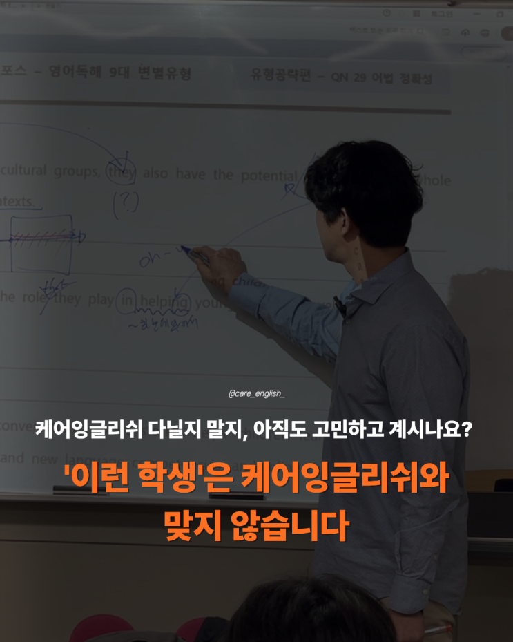 1. 공부에 의지가 없는 학생 케어잉글리쉬에서는 모든 숙제를 선생님께 검사받아야 하며, 단어는 하나라도 틀리면 재시험을 치고, 문법 역시 완전히 통과할 때까지 반복 학습합니다. 따라서 아직 공부할 마음의 준비가 되어 있지 않은 학생은 의지가 생겼을 때 다시 찾아와 주세요. 그때는 누구보다 든든한 지원군이 되어드리겠습니다. 2. 사춘기 때문에 학습 집중이 어려운 학생 특히, 중1이 되면서 갑자기 눈빛이 돌변하는 친구들이 있습니다. 새로운 친구를 사귀고, 그 친구들과의 시간이 너무 소중하게 여겨집니다. 그러면 학원에서 숙제까지 하면서, 오래 앉아 있는 것을 극도로 싫어하게 됩니다. 그래서 편하고, 대충해도 확인하지 않고, 친....... <img src="https://blogthumb.pstatic.net/MjAyNjA0MTNfMjcx/MDAxNzc2MDc5MDI0NDQ5.O2UDJDGMESXb8GM4F2q9qAjnlk2SuGC1g0ND_fFvWqwg.0zTfdeU6oR1n6iGuG3JTp3329aiRpWacIier0GQ_FFEg.PNG/1.png?type=s3" />