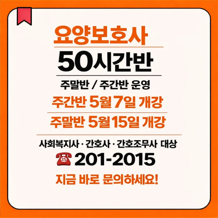 #명지요양보호사교육원5월7일사회복지사간호사간호조무사반개강50시간반. 장기요양보험의 핵심 수행인력 요양보호사! 사회복지사 간호사 간호조무사 자격있는 분들을 위한 50시간반 시작됩니다. 주간반. 5월7일목 시작 9시30분시작~오후6시까지. 7일 종일 수업 + 1일 요양원실습. 접수일. 5월3일일~5월5일화 접수시간. 오후4시~오후8시 야간반 5월15일 시작. 금요일. 오후6시~오후10시. 4회 토요일. 오후2시~오후10시. 4회. 하루, 요양원 실습합니다. 접수일. 5월12일화~5월14일목 접수시간. 오후4시~오후8시. 접수기간안에 접수해야 수업참가 할 수 있습니다. 등본1, (본인주민번호는 전부 나타나게 출력) 자격증사본1 (원본제시) 사진1 함께 제....... <img src="https://blogthumb.pstatic.net/MjAyNjA0MTlfNTQg/MDAxNzc2NTkyMTg1NTIx.EZo50xFc4EnZaOwFr9-6VNBiqKIVD_aqd4xifYDpHZQg.7ADu6Oq_7Gf2Bou9WUmh49UEPvzYo8qMRiJs87CrJzQg.PNG/900_file_0000000005147209be5588b0b58d983c.png?type=s3" />